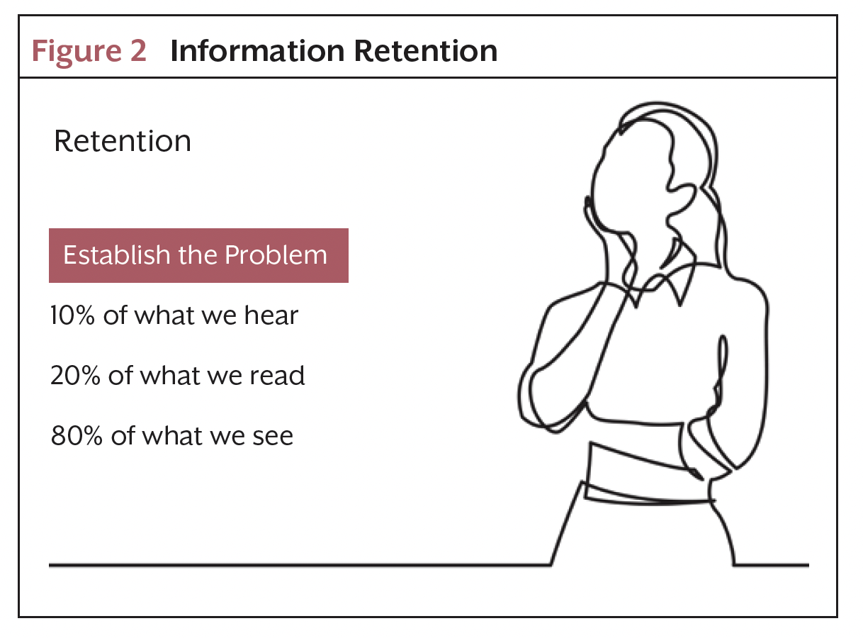Although cognitive science principles offer an abundance of supportive information, one other factor is crucial regarding information presented to people with stressed or traumatized mindsets. The lowest retention rate human beings have for information is words that they hear8 (Figure 2). Yet often this is the way healthcare providers impart the most critical information to patients. If the recipient of information has just been thrust into trauma-processing mode, the retention rate is lower still.7 Almost everyone in medicine has had the experience of a patient returning who did not effectively process or retain the information that was given to them at a prior visit.