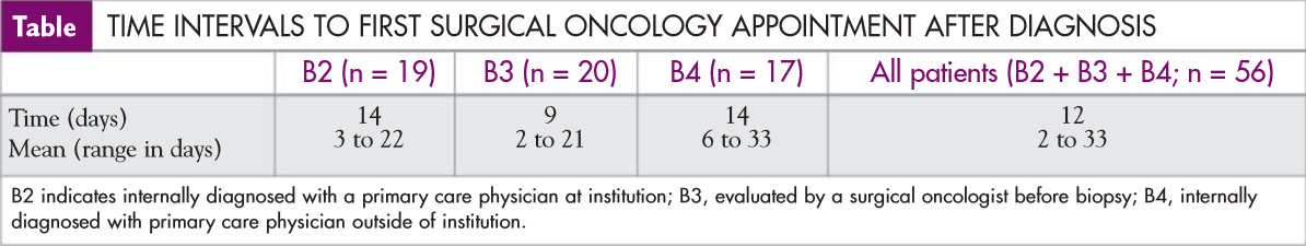 Results: In total, 150 patients were divided into 4 categories: external pathology consult (B1), internally diagnosed with a primary care physician (PCP) at our institution (B2), evaluated by a surgical oncologist before the biopsy (B3), and internally diagnosed with PCP outside of the institution (B4). For B2, B3, and B4, we examined the time intervals to first surgical oncology appointment after diagnosis as shown in the Table. For all patients (n = 10) who received neoadjuvant therapy, 1 patient saw a surgical oncologist, medical oncologist, and radiation oncologist; 9 patients saw 2 subspecialties prior to initiation of first treatment.