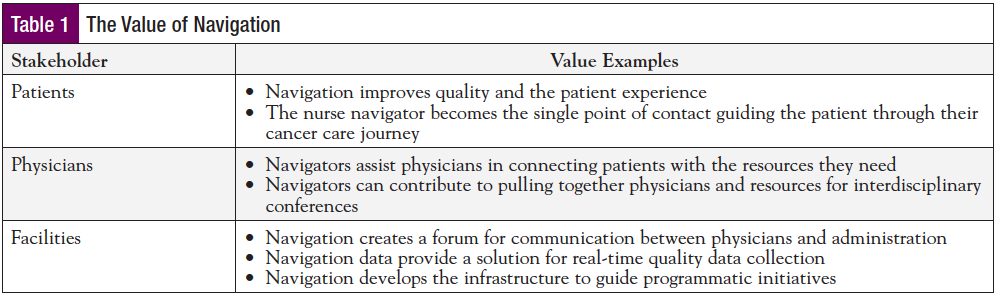 The value of navigation for each of your stakeholders is different, but equally important. When communicating to each stakeholder, be sure to highlight areas of value that benefit their roles within patient care (Table 1).