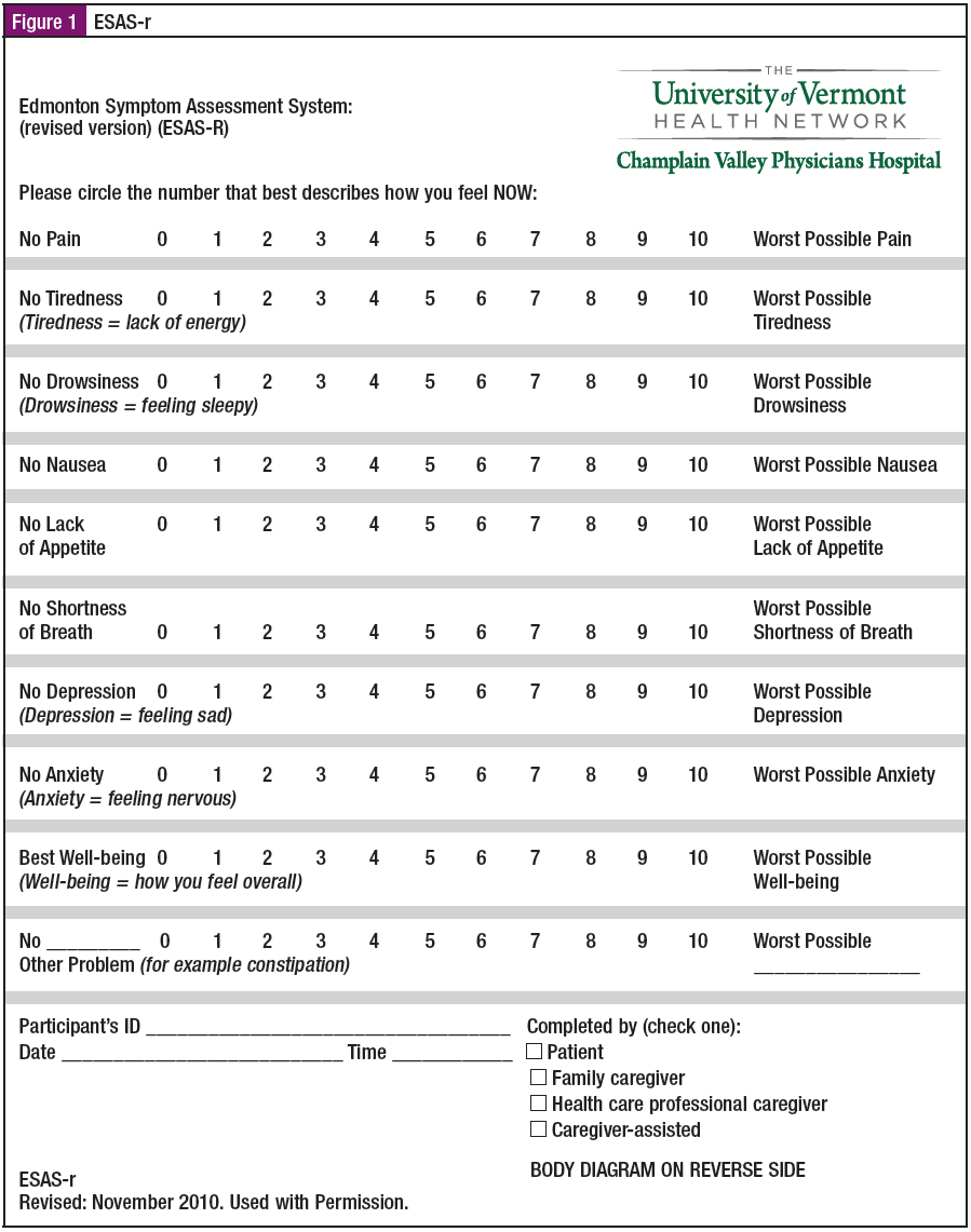The study design was quantitative, utilizing descriptive statistics and anecdotal commentary. The validated tool was a combination of a focused self-assessment survey, the Edmonton Symptom Assessment System-revised (ESAS-r) (Figure 1), a rudimentary drawing of a body to indicate location of pain; an area to denote changes in the use of pain, anxiety, or nausea medications; and a section for comments.
