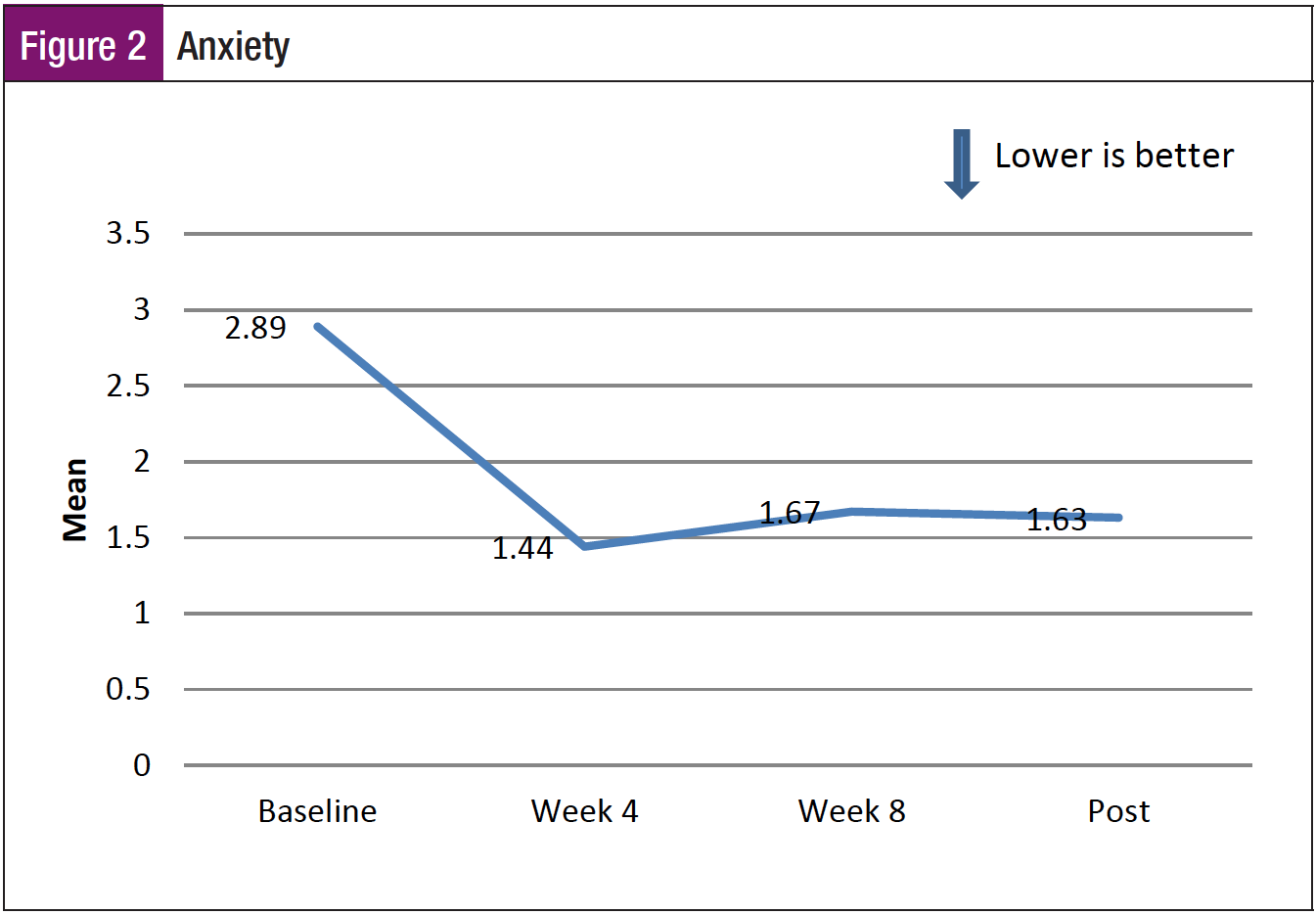 As hypothesized, a decrease was noted in a majority of symptoms from baseline to week 8, with an increase at the postintervention data point. It is noted that anxiety did not increase as anticipated at the post­intervention data point. This was unexpected but understood through participants’ comments.