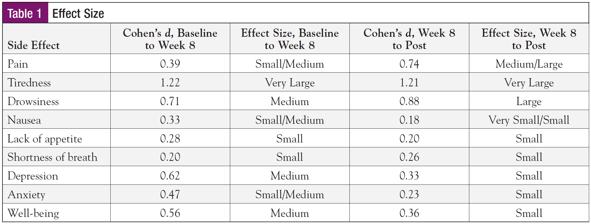 Due to treatment schedules, hospitalizations, and previously planned “life-affirming” events, only 2 participants were able to attend all 8 yoga sessions. Because of the extremely small sample and inability to achieve statistical significance, effect size was calculated to further understand the size of the impact of the intervention on the participants. Effect size was calculated at baseline, week 8, and 1 month after completion for each of the side effects evaluated on the ESAS-r (Table 1). Effect size is determined by calculating the mean of comparison groups and dividing by the standard deviation. Effect size values are correlated to a standard measurement, Cohen’s d, which is then used to compare the calculated effect size values.