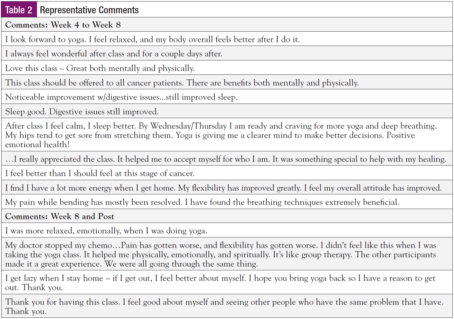 It is hoped that this study, despite its limitations, will open conversations among ONNs, oncology providers, community yoga providers, and the people they care for.