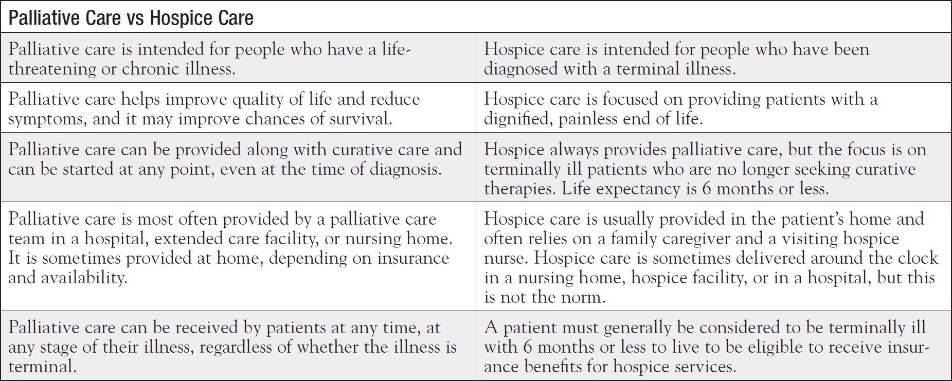 Most people have heard of palliative care, but few truly know the meaning. Palliative care is related to, but not the same as, hospice care. Palliative care is focused on improving the quality of life for patients who are living with a chronic or life-threatening disease. It is holistic and patient-oriented care, and it provides symptom management and psychosocial and spiritual support. The patient and his or her family are at the center of the palliative care team, which can provide support as the treatment moves along. Palliative care can be provided along with curative care, which might include surgery, chemotherapy, biotherapy, or radiation treatments. Hospice care is provided for patients who have a life expectancy of 6 months or less, and who can no longer benefit from curative treatment. Palliative care is provided for patients regardless of life expectancy. And while hospice care is palliative, not all palliative care is hospice (Figure 1).