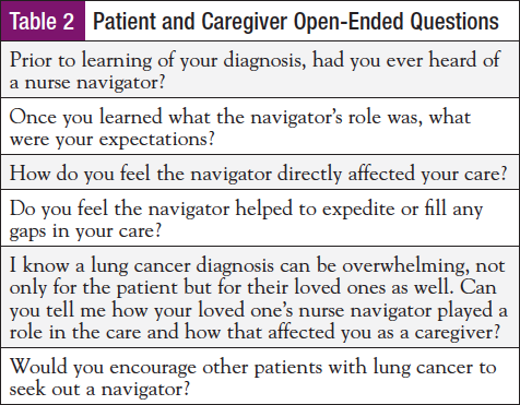 Several patients and caregivers were interviewed by the LCNN using open-ended questions to evaluate their perspectives on navigation services and the impact of navigation on lung cancer patients (Table 2).