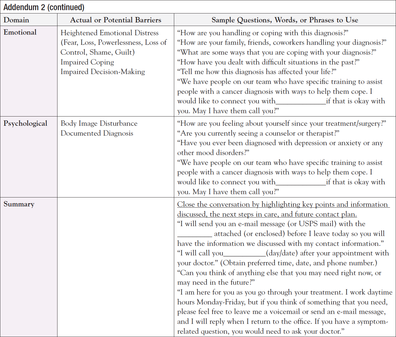 Two additional findings came from this project. The first finding was in the area of assessment skills. Prior to implementation of the new Supportive Care Navigation Barrier Assessment, training was conducted with both the ONNs and the nonclinically licensed navigators on motivational interviewing and the use of open-ended questions in conducting the barrier assessment. Each member of the oncology patient navigation team was provided with a laminated sheet (Addendum 2) to keep with them that provided the domains, the actual/potential barriers to care, and sample questions, words, or phrases that could be used to elicit information from the patient. It was important to the oncology patient navigation leadership team that there was an understanding that the Supportive Care Navigation Barrier Assessment was to be used in a conversational way with the patient, rather than as just another form that needed to be completed. The oncology patient navigation team reported that they felt that through the training conducted prior to the use of the new Supportive Care Navigation Barrier Assessment (Addendum 3) and the actual use of the tool, that their assessment skills had been enhanced and that they were able to more completely identify barriers that prevented their patients from receiving or continuing care.
