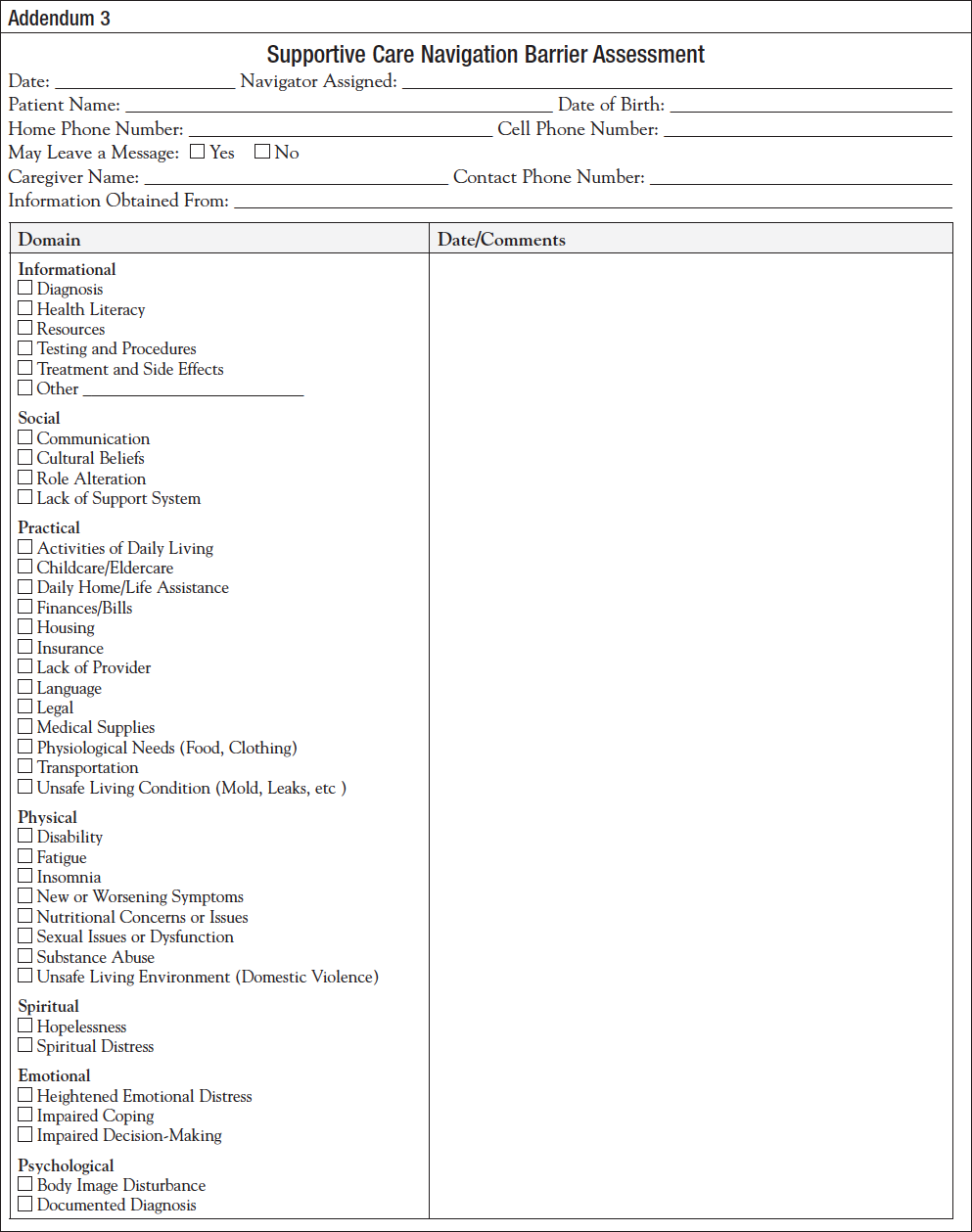 Assessment of barriers is an integral part of navigation and one of its primary attributes.1,3 As such, there is a demonstrated need for standardization in barrier assessment and the use of a framework to guide the navigation process and improve the effectiveness of the program.11 The Supportive Care Navigation Barrier Assessment provides both standardization and use of a conceptual framework. It is also ideally suited to allow for individualization within the domains by individual navigation programs.