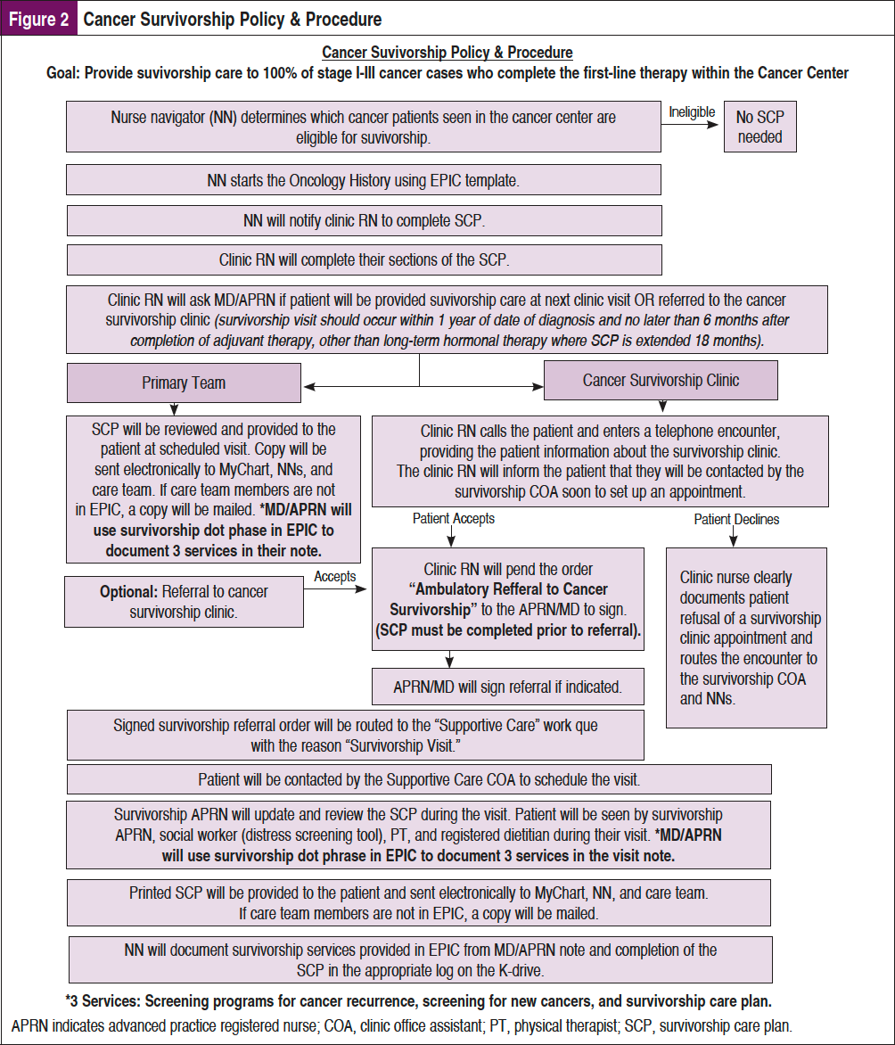 A report issued by the US Centers for Disease Control and Prevention and the National Cancer Institute, along with data from the American Cancer Society (ACS), estimates that the number of cancer survivors in the United States will reach 20 million by 2026.1 Survivors are often lost in transition once they finish treatment, moving through different systems in which few guidelines exist to assist them through the next stage of their life or help them overcome the medical and psychosocial problems that may arise.2 Many cancer survivors experience physical, psychosocial, financial, and logistical concerns, along with long-term effects of cancer and its treatment, which affect quality of life.1,2 The goal of the cancer survivorship model is to deliver comprehensive care that includes medical and psychosocial services, cancer screening, assessment of and intervention for late effects, and healthy lifestyle counseling. To date, the literature documents only a limited number of models that achieve this comprehensiveness, and few have been evaluated for health outcomes.3 Thus, the establishment of successful, evidence-based survivorship care models remains a work in progress.3 In 2020, the American College of Surgeon’s Commission on Cancer (CoC) updated its Survivorship Standard 4.8 requiring an interprofessional survivorship care team that determines a list of services to address the complex needs of cancer survivors. The current survivorship practice in our academic cancer center did not align with the CoC’s updated survivorship standard.4
