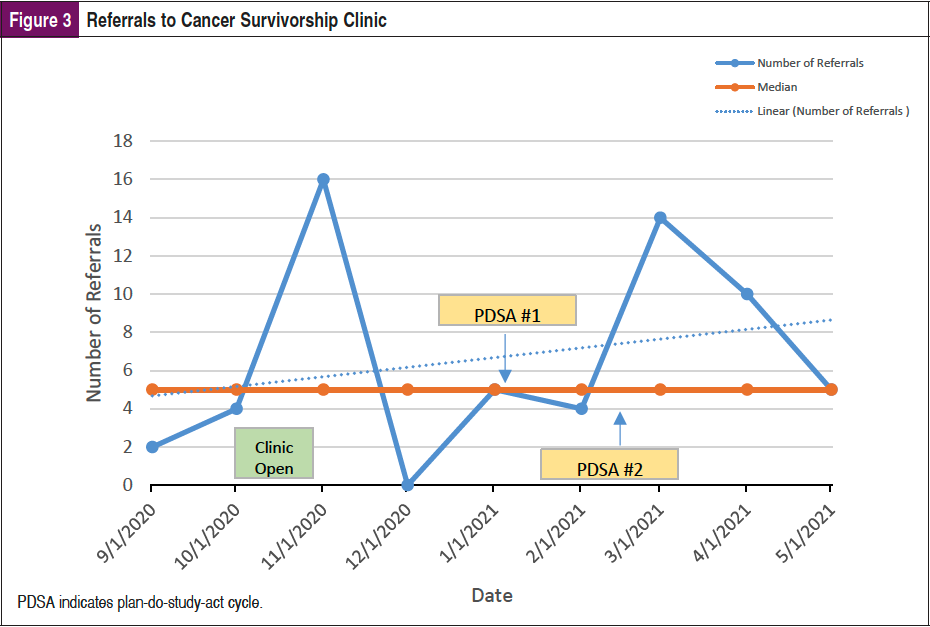 Run charts are one of the most important tools for assessing the effectiveness of change.21 The run chart examining referrals to the cancer survivorship clinic showed improvement over time. The study started September 2020, the clinic opened October 2020, PDSA cycle #1 was completed January 2021, PDSA cycle #2 was completed February 2021, and study was completed May 2021.
