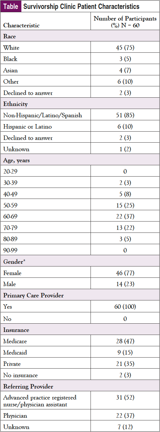Overall, 60 patients had an order “ambulatory referral to cancer survivorship” in the EMR placed to the cancer survivorship clinic between September 2020 and May 2021.