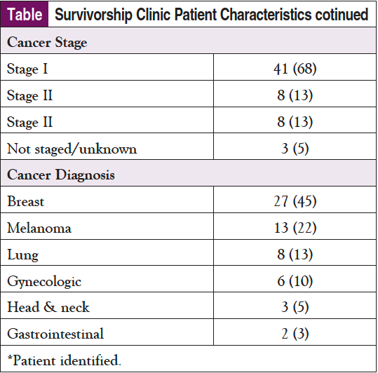 Sixty-one percent of patients referred to the cancer survivorship clinic accepted the referral, and 47% of patients were seen. Six scheduled patients cancelled; reasons included not feeling well; transportation issues; childcare issues; term “survivorship was distressing”; no show; and error in referral (patient inadvertently scheduled in wrong clinic—referral was for smoking cessation). Hispanic patients were more likely to accept the referral than other ethnic groups (P <.03). Patients with melanoma were less likely to accept than other groups (P <.002).