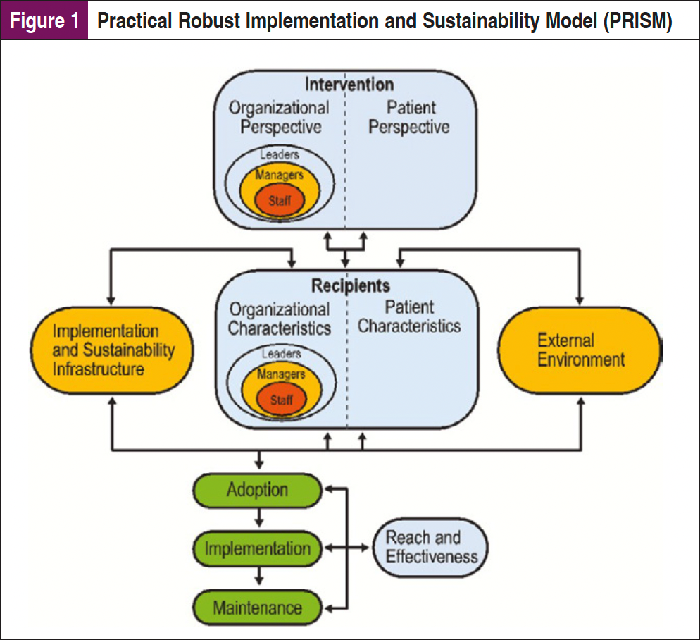 These types of tools can be implemented to benefit both the patient and the provider in terms of efficacy, accessibility, and feasibility. However, implementation of digital health tools into clinical care requires planning and an understanding of the institutional context and workflows to ensure that these tools are truly integrated into care. Dissemination and Implementation (D&I) science frameworks are essential to a systematic approach to explore the factors that will facilitate implementation of these tools. There are multiple D&I frameworks that can be considered, including the Practical Robust Implementation and Sustainability Model (PRISM), which expands the Reach, Effectiveness, Adoption, Implementation, Maintenance (RE-AIM) framework to identify contextual factors (eg, organizational and patient perspectives) impacting implementation (Figure 1). These multilevel contextual factors can impact operational processes and available resources unique to different healthcare sites and systems.13-15