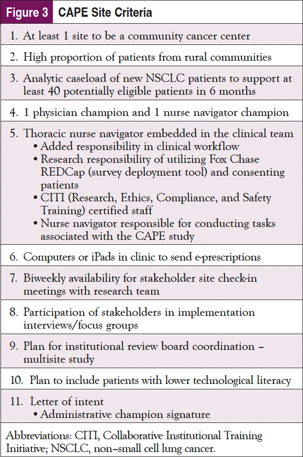 FCCC and Temple Fox Chase (TFC), both within the broader Temple University Health System, were the first sites identified and represented an urban/suburban health system that serves a diverse group of patients. Both FCCC and TFC had analytic caseloads large enough to support the needs of the CAPE study and different navigation models, as well as institutional support and buy-in. At TFC, there was no involvement of navigation but rather provider support, whereas at FCCC, they predominantly have intake navigators who touch the patients mainly when they are newly diagnosed. The additional sites were selected based on criteria shown in Figure 3 to ensure representation and commitment to the CAPE study.