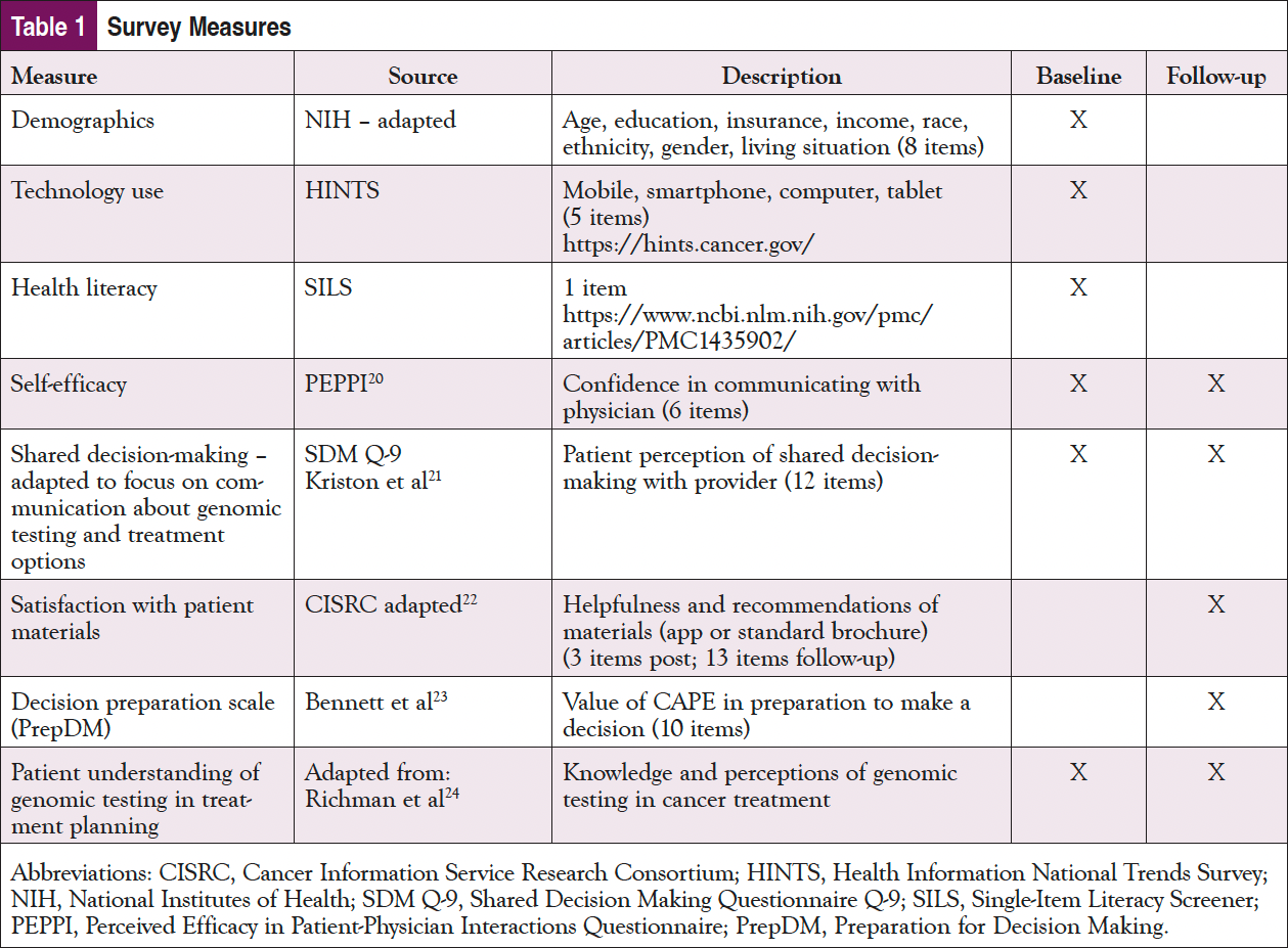 The FCCC study team conducted follow-up surveys for all sites and study participants over the phone 1 month after e-prescriptions were sent. The baseline and follow-up surveys for patients included common measures for technology use, including the Health Information National Trends Survey (HINTS), Perceived Efficacy in Patient-Physician Interactions (PEPPI), knowledge of genomic testing, Preparation for Decision Making (PrepDM), and satisfaction with the tool. In addition, the follow-up included multiple open-ended questions to gather feedback on the tool. The measures used are listed in Table 1.19-25