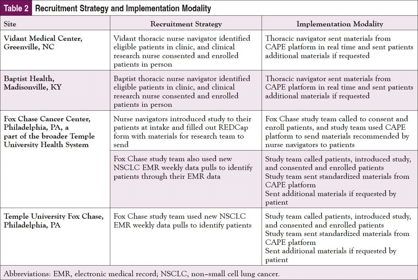 Patient recruitment and implementation of the study participants were tailored based on the needs, staffing, and resources at each of the 4 sites (Table 2).