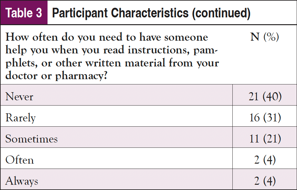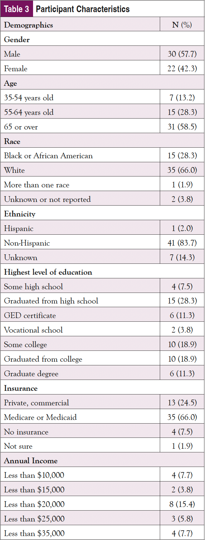 As shown in Table 3, nearly 60% of the sample identified as male and 65 years or older; almost 30% identified as Black or African American, and 2% indicated they were Hispanic. Only about one-fourth had a college education, and most were on federally funded insurance. Despite being an older population, nearly 3 in 4 participants indicated that they use the internet at least once per day, with over 60% using it multiple times per day; 90% of participants said that they access the internet using a cellphone, smartphone, or tablet. Fewer than half reported that the internet is their first source of healthcare information; however, only about 20% of the sample stated they trusted information about cancer on the internet “a lot." Doctors or other healthcare providers were the first source for an additional 40% of participants. Almost 1 in 4 participants indicated some issues with health literacy and reported sometimes needing help, and 4% reported they often or always need help when they read instructions, pamphlets, or other written material from their doctor or pharmacy.