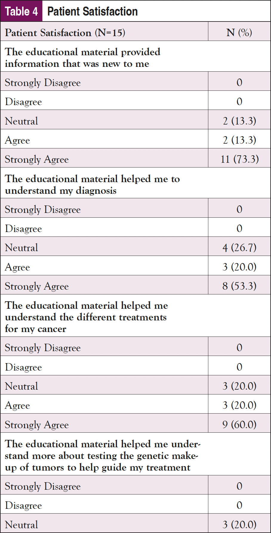 Knowledge about genomic testing was assessed using an adapted knowledge test. In the pretest, participants were asked to first rate their knowledge on a scale of 1 (not at all) to 5 (extremely) on the role of genomic testing in determining treatment options, followed by 5 knowledge questions, each worth 1 point for a total top score of 5. The same 5 knowledge questions were asked again at the posttest. The mean score for the self-assessment of knowledge was the same as the pretest knowledge scores, indicating that participants accurately estimated their knowledge regarding genomic testing. The posttest knowledge scores increased slightly, indicating that the patient materials were somewhat helpful at increasing knowledge.