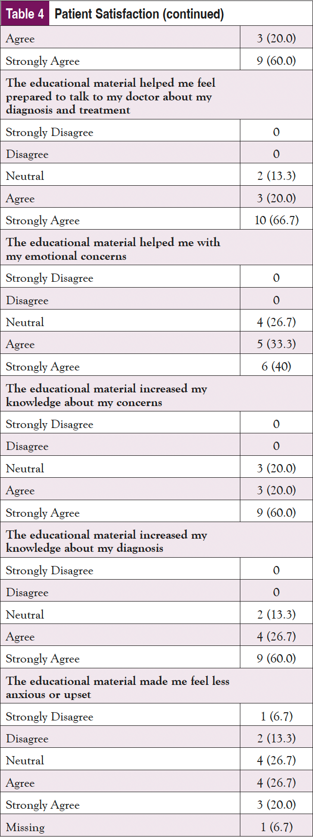 A pretest/posttest design was utilized for the patient evaluation using standardized questions regarding knowledge, engagement with provider, and satisfaction collected through a baseline survey and telephone follow-up survey.