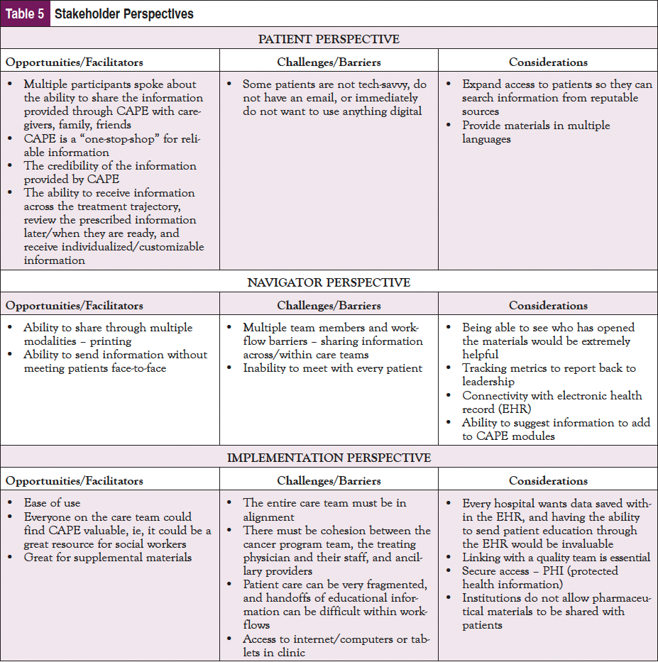 In addition to the pilot study, a focus group at the AONN+ 2022 Midyear meeting in Austin, TX, was conducted with 10 navigators to evaluate perceptions of the CAPE platform and address additional barriers/solutions to implementation in different oncology clinical settings. Participants were geographically diverse and represented various clinical roles and navigation types. Dr Fleisher’s team administered preread materials consisting of access to the CAPE platform, background information on CAPE, and a presurvey to collect initial thoughts of the platform, and conducted the focus group that centered on patient, navigator, and implementation perspectives. Dialogue from the focus group supported findings from the pilot study and was coded, and key takeaways focusing on opportunities/facilitators, challenges/barriers, and recommendations and considerations from the patient, navigator, and implementation perspective are highlighted in Table 5.