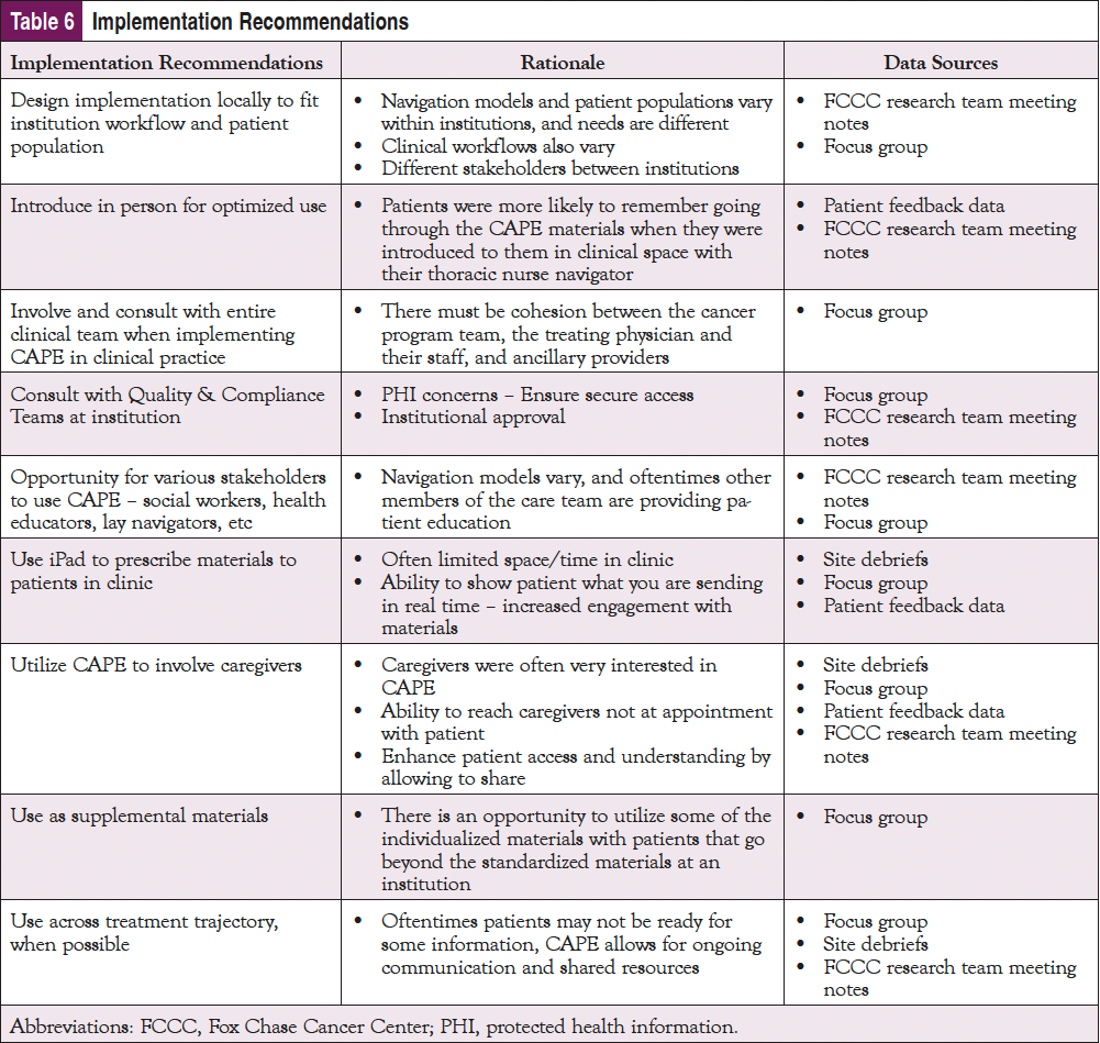 The majority of the patients who used the CAPE resources viewed them positively. However, some patients felt overwhelmed by their diagnosis or other external factors, so their ability to use or absorb the information provided through CAPE was diminished. This provides an important connection between the patient and the navigator and an opportunity to assess the patient’s emotional needs prior to prescribing specific information. In addition, using this tool in conjunction with a navigator or clinical team could increase utilization. Based on these findings, AONN+ believes there are strategic points in the patient care process at which CAPE could be introduced into the treatment trajectory. A one-size-fits-all approach to implementation timing may not be optimal. As shown in Table 6, a number of key implementation recommendations emerged from patient and organizational perspectives.