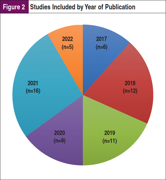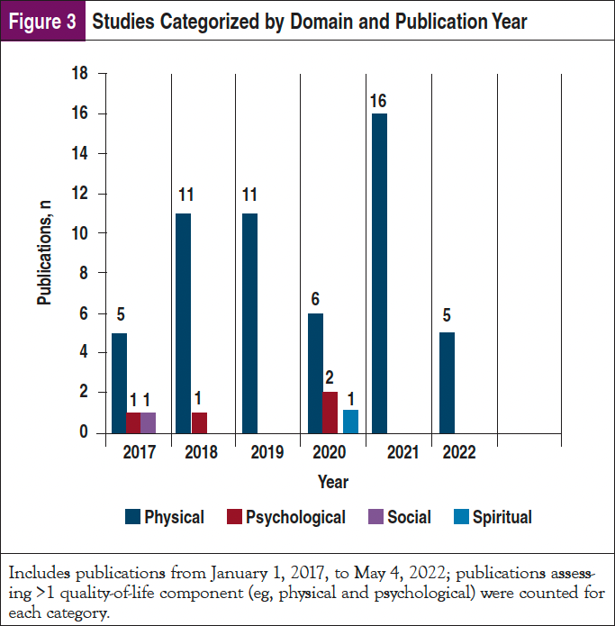 Included studies were published between January 1, 2017, and May 4, 2022. Figure 2 shows the year of publication of studies included in this scoping review. Figure 3 shows studies categorized by QOL domain and publication year.