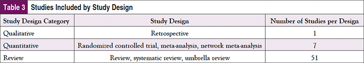A total of 1 study used a qualitative design, 7 a quantitative design, and 51 used review or systematic review methodology. Table 3 shows the studies included in this scoping review by study design.