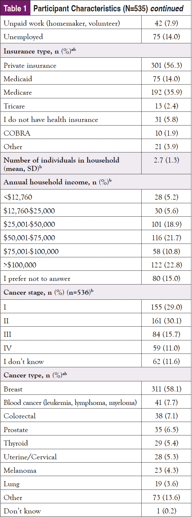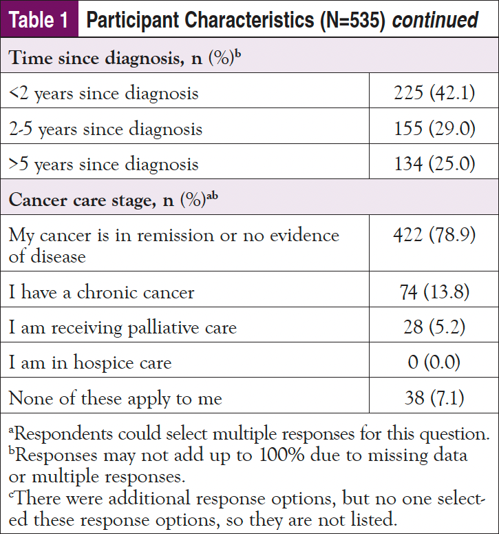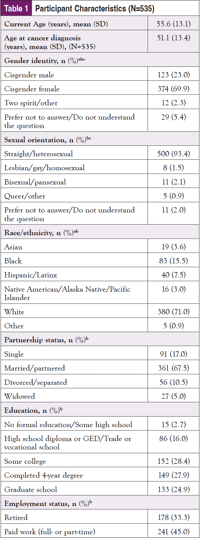 Participants represented 43 states and the District of Columbia in the United States. Approximately 7% of the sample reported being part of a tribe or territory (n=36). Our population was on average age 55.6 years (SD=13.1). The sample primarily identified as cisgender female (70%), straight/heterosexual (93%), White (71%), and married or partnered (68%). Most of the participants were employed part-time or full-time (45%) or retired (33%). Level of education, type of insurance, and household income varied widely. The most common diagnoses reported were cancers of the breast (58%), hematologic (8%), colon or rectum (7%), and prostate (7%). Cancer stages at diagnosis were most commonly stage I (29%) or II (30%), with most respondents indicating that their cancer was in remission or they had no evidence of disease (79%) (Table 1).