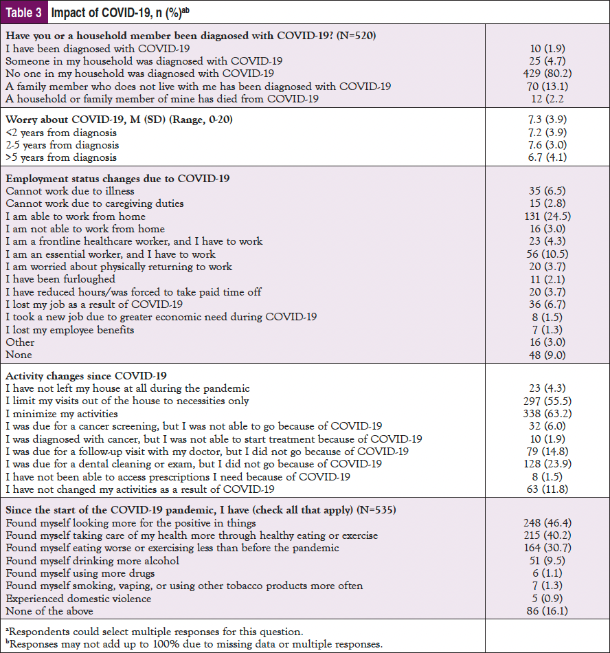 Respondents were also asked if they or friends or family members had been diagnosed with COVID-19. An open-ended question asked participants to share any additional comments of their experiences as a cancer survivor during the pandemic to inform future improvements to cancer survivorship care.