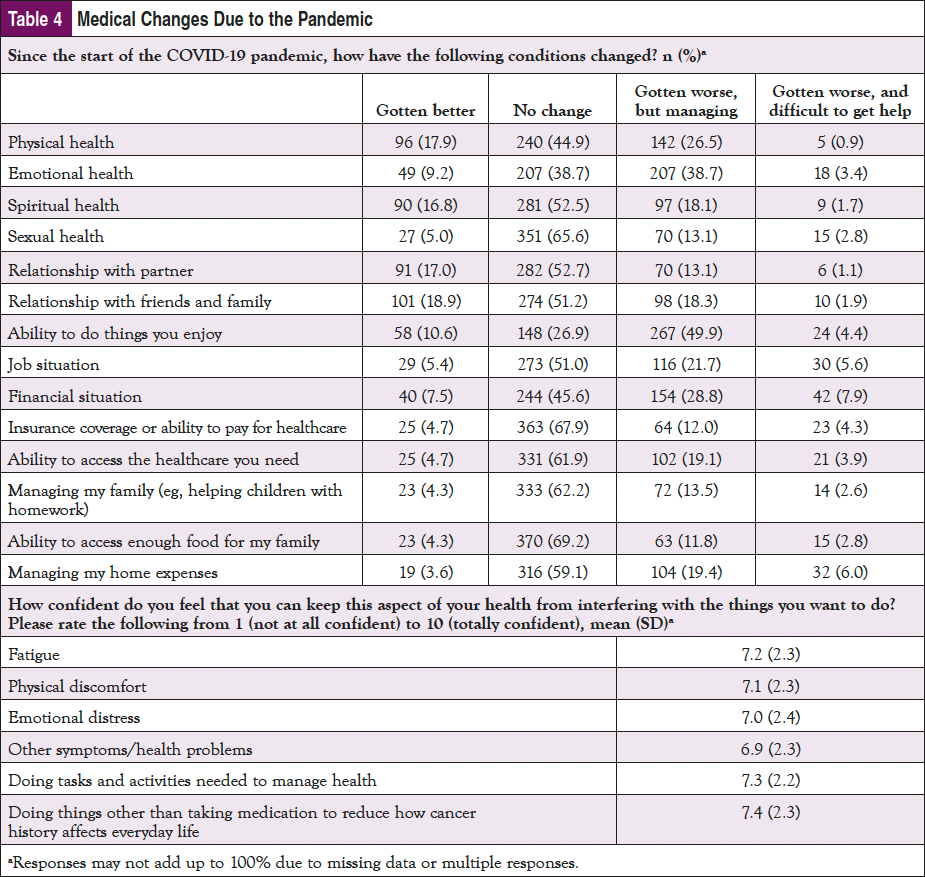 Respondents completed an 88-item questionnaire, previously published,12 which included questions about demographics (ie, age, gender identity, sexual orientation, race/ethnicity, partnership status, education, employment status, insurance type, and household size and income) along with adapted measures from the literature. Measures included the unpublished Impact of the COVID-19 Pandemic and Health Related Quality of Life (HRQOL) in Cancer Patients and Survivors scale (accessible on PhenX toolkit), the Self-Efficacy for Managing Chronic Disease 6-Item Scale, the Self-Administered Comorbidity Questionnaire, and the 12-Item Short Form Survey (SF-12). For surveys that used Likert scales, scales were eliminated and checklists were incorporated to reduce the length of the survey. For the Impact of the COVID-19 Pandemic and HRQOL in Cancer Patients and Survivors scale,13 5 items were added to measure positive responses to the pandemic. The Preparing for Your Doctor’s Visit worksheet from the Advancing Patient-Centered Cancer Survivorship Care Toolkit14 was used to ask about whether physical health, emotional health, spiritual health, sexual health, relationships, ability to do things, employment, finances, and insurance coverage had gotten better, worse, or not changed since the start of the pandemic.