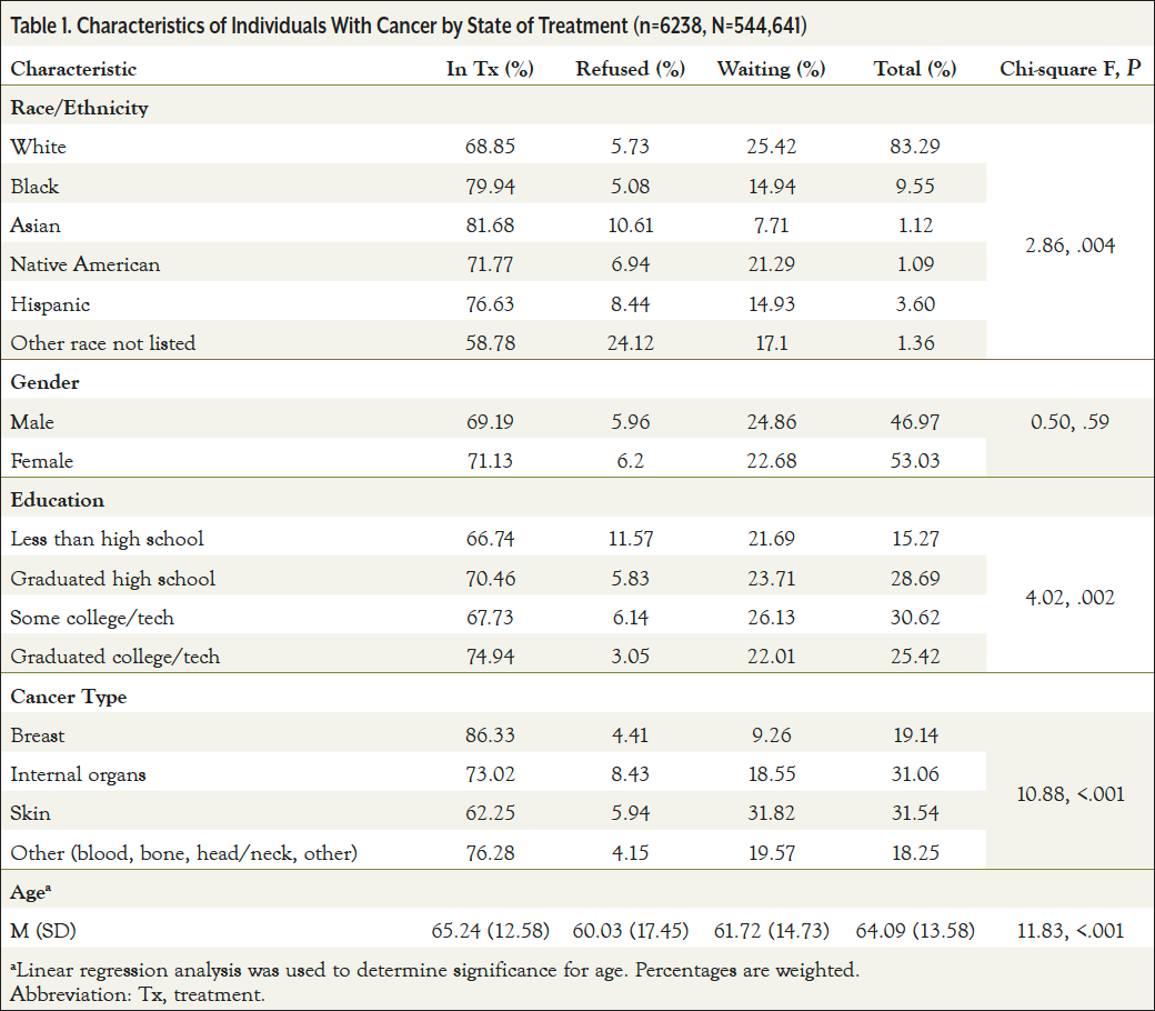 Results: The sample included 6238 individuals of whom 83% were White, 53% were female, and over half reported attending college or technical school. Individuals with cancer of internal organs had higher rates of cancer treatment refusal at 8.43%, compared with 4.41% for breast cancer, 5.94% for skin cancer, and 4.15% for other types. Individuals who did not graduate high school were nearly twice as likely to refuse cancer treatment than other education groups (11.57%; P <.01).