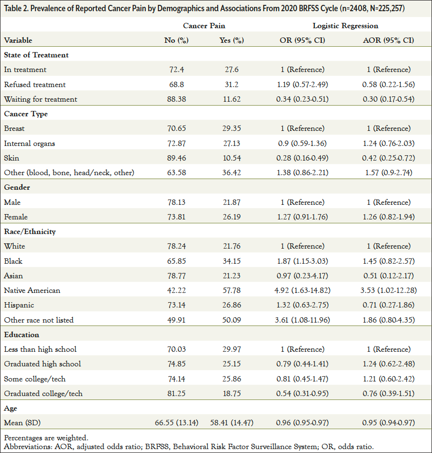 Methods and Study Design: We performed a cross-sectional study using the 2017-2020 BRFSS to analyze the prevalence of individuals who refuse or delay cancer treatment by type of cancer and sociodemographics using chi-square tests. In addition, we used logistic regression to determine whether individuals who refused treatment were more likely to report cancer-related pain.