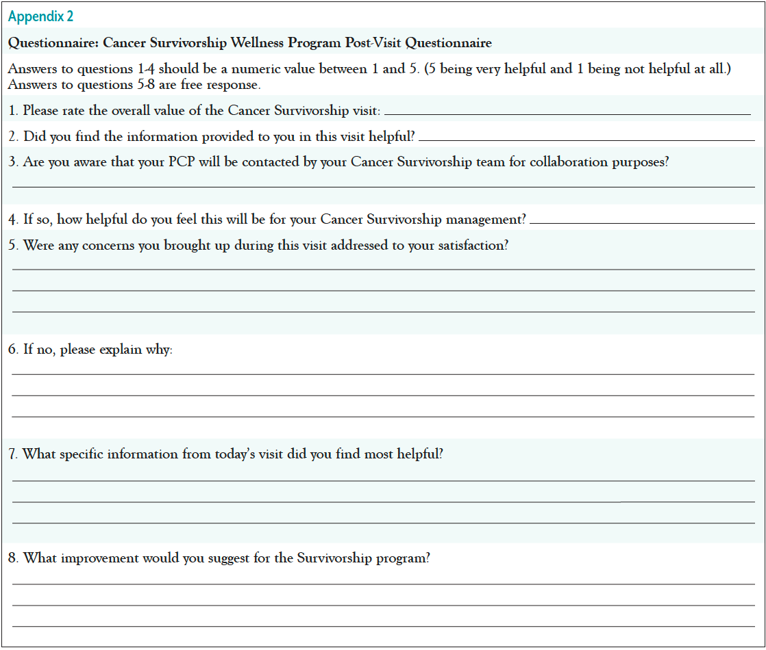 A survivorship patient survey was created to obtain feedback related to changes being made with the RN navigator–driven Survivorship program. The survey was sent via the patient’s EMR and asked questions pertaining to how helpful the visit was for the patient, as well as if the patient was aware of the connection between the Survivorship RN navigator and their PCP. Additional questions were specific to what was discussed during the survivorship visit, what was most helpful, and what improvements would be helpful to continue to grow this program. See Appendix 2 for additional details pertaining to the patient survey. This survey was created after the interventions were implemented to gauge how the patients were responding to the new program.
