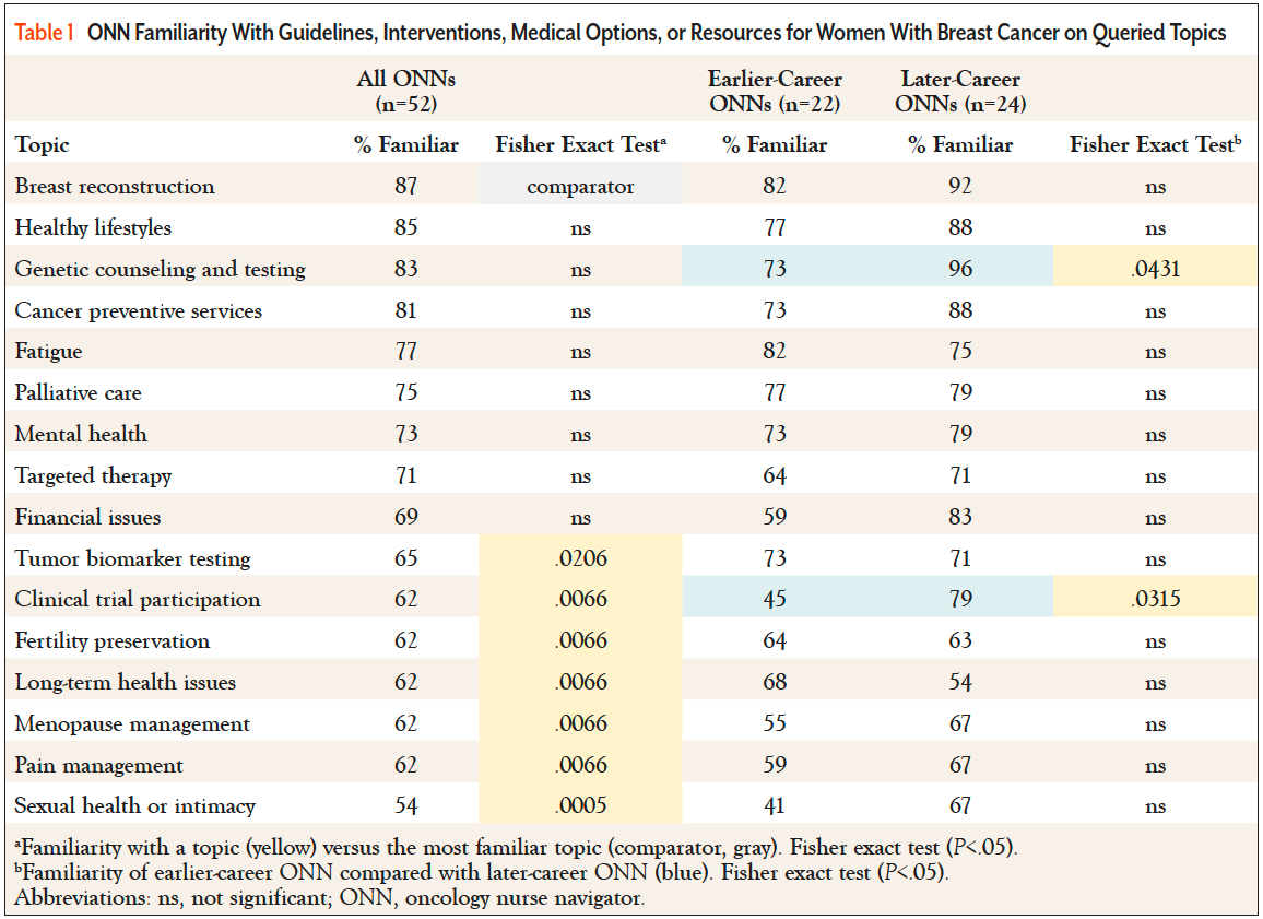 Earlier-career ONNs were less familiar than later-career ONNs for most topics, but this was statistically significant only for clinical trial participation and genetic counseling and testing.