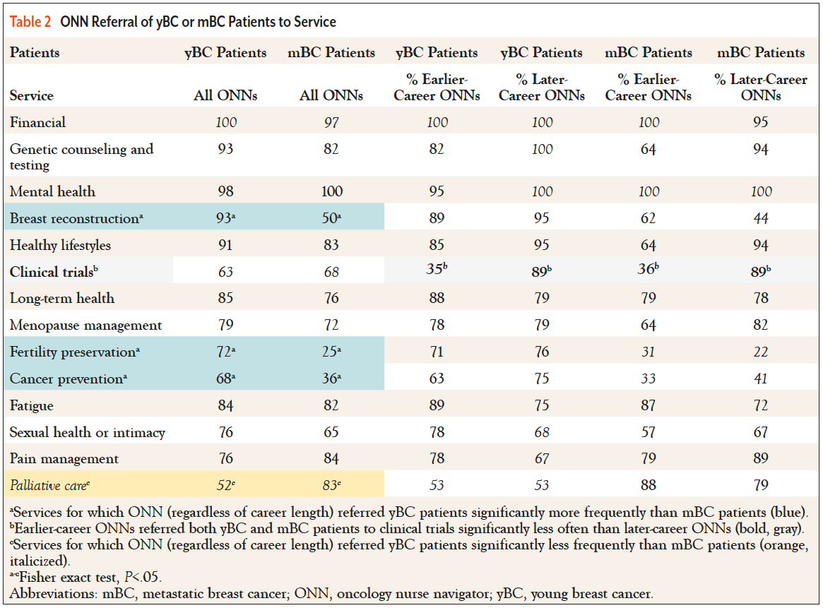 Table 2 shows referral patterns of ONNs for the prior 6 months. Most ONNs referred yBC and mBC patients for financial, mental health, or genetic testing services. For many other services, referral patterns of yBC and mBC patients differed. ONNs referred yBC patients more frequently (Table 2, blue bars) than mBC patients to breast reconstruction (P=.00001), fertility preservation (P<.00001), and cancer prevention services (P=.0091), and less often to palliative care (Table 2, orange bars; P=.0048).
