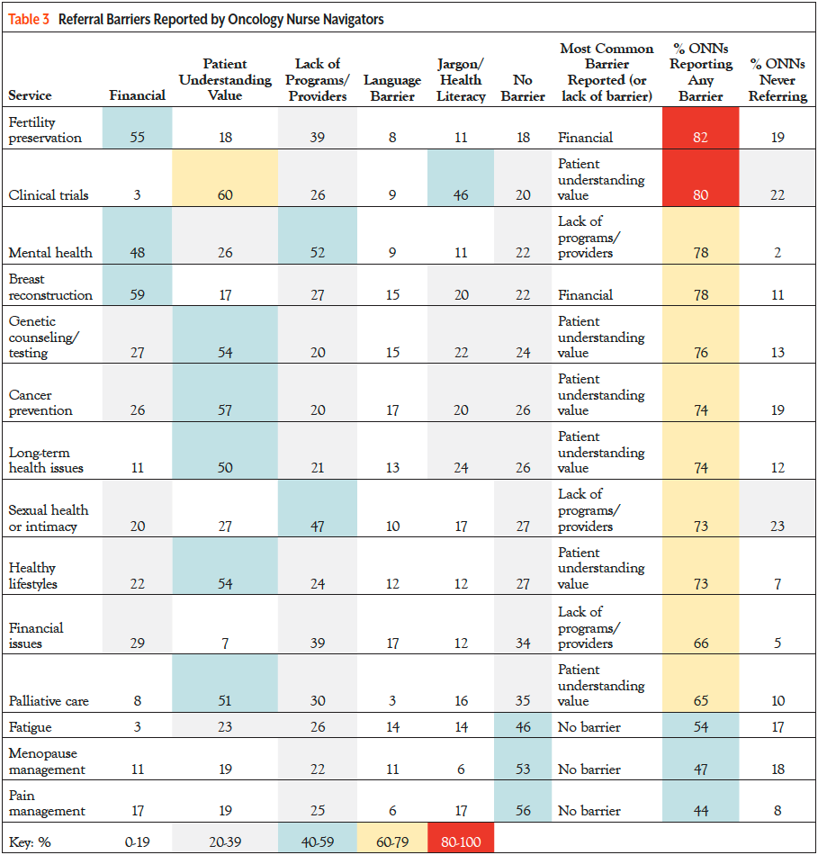 Second, a key role of ONNs is helping patients and their families navigate healthcare system barriers.20 It is telling that ONNs reported multiple and significant barriers to most support services. “Patient understanding of value” was perceived as a significant barrier to referral for many services; however, the underlying reasons may vary between services. For example, patients’ lack of interest in genetic counseling and testing may be due to a lack of understanding of how inherited mutation status impacts cancer treatment or relatives’ health. Lack of interest in palliative care may reflect confusion between palliative care, which includes serious but nonterminal disease, and hospice or end-of-life care. Therefore, service-specific efforts to increase patient awareness and improve understanding of value may help.