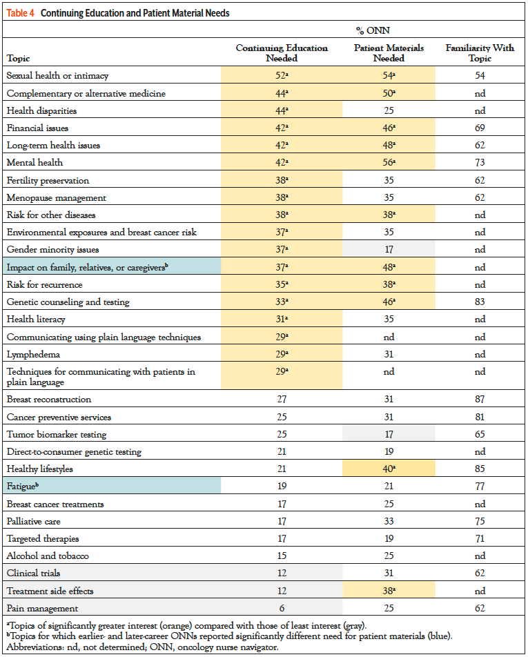 Table 4 summarizes ONNs’ interest in continuing education and patient education topics (orange bars highlight topics of significant interest). The majority were interested in continuing education about sexual health and intimacy and not interested in topics of clinical trials, palliative care, targeted therapies, and alcohol and tobacco use. Earlier- and later-career ONNs reported similar continuing education interests—despite differences in familiarity. The most requested topics for patient education materials were mental health, sexual health/intimacy, and complementary/alternative medicine, paralleling interests in continuing education. ONNs reported needing patient materials about healthy lifestyles and palliative care, despite low interest in corresponding continuing education opportunities. Last, earlier-career ONNs more frequently cited a need for patient materials than their later-career counterparts about fatigue (41% vs 4%) and impacts on family or caregivers (68% vs 33%).
