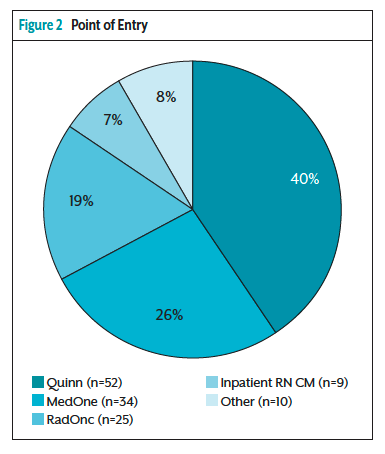 For purposes of this PDSA cycle, data collection from June 1, 2021, to June 1, 2022, was analyzed to quantify the benefits of upstream oncology nurse navigation. A total of 130 patients with lung cancer were navigated during this time frame. A retrospective chart review identified that 40% (n=52) of the patients navigated entered through thoracic surgery. When determining other points of entry, 26% of the patients entered through medical oncology (n=34), 19% through radiation oncology (n=25), 7% through inpatient RN case managers (n=9), and 8% other (n=10) (Figure 2). This demonstrates an opportunity to capture patients who do not enter through thoracic surgery at the time of diagnosis versus initial consult
