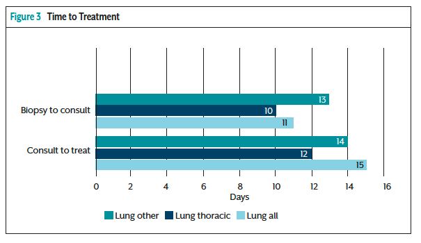 Lung cancer care requires a multidisciplinary team approach with thoughtful and effective coordination and communication across multiple disciplines, including primary care, radiology, pulmonology, medical oncology, radiation oncology, and surgery.2 According to the literature, time to treatment (TTT) is considered a quality indicator for cancer care, but it is not well defined. TTT is difficult to quantify based on the complexity of the diagnostic process and treatment decisions depending on the stage, performance status, and quality of life (QOL).2