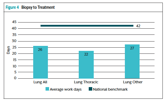 As a result of the implementation of upstream nurse navigation, the outcome measures showed a 3-day decrease from the diagnosis to consult and a 2-day decrease from consult to treatment based on where a patient entered the system (Figure 3). An in-depth analysis revealed that ONN involvement improved time from biopsy to initial consult by 18% compared with patients who did not have an ONN facilitating a timely referral and subsequent consult. Another key finding of the collected data demonstrated that the average length of time from the biopsy to treatment initiation for all lung cancer patients navigated was 25 days, compared with the national benchmark to offer treatment within 42 days of initial diagnosis (Figure 4). Despite not having a benchmark for TTT specific to ONN involvement pre- and postimplementation of the program, we are setting the bar by initiating treatment almost 2 weeks sooner when compared with the national TTT recommendation.