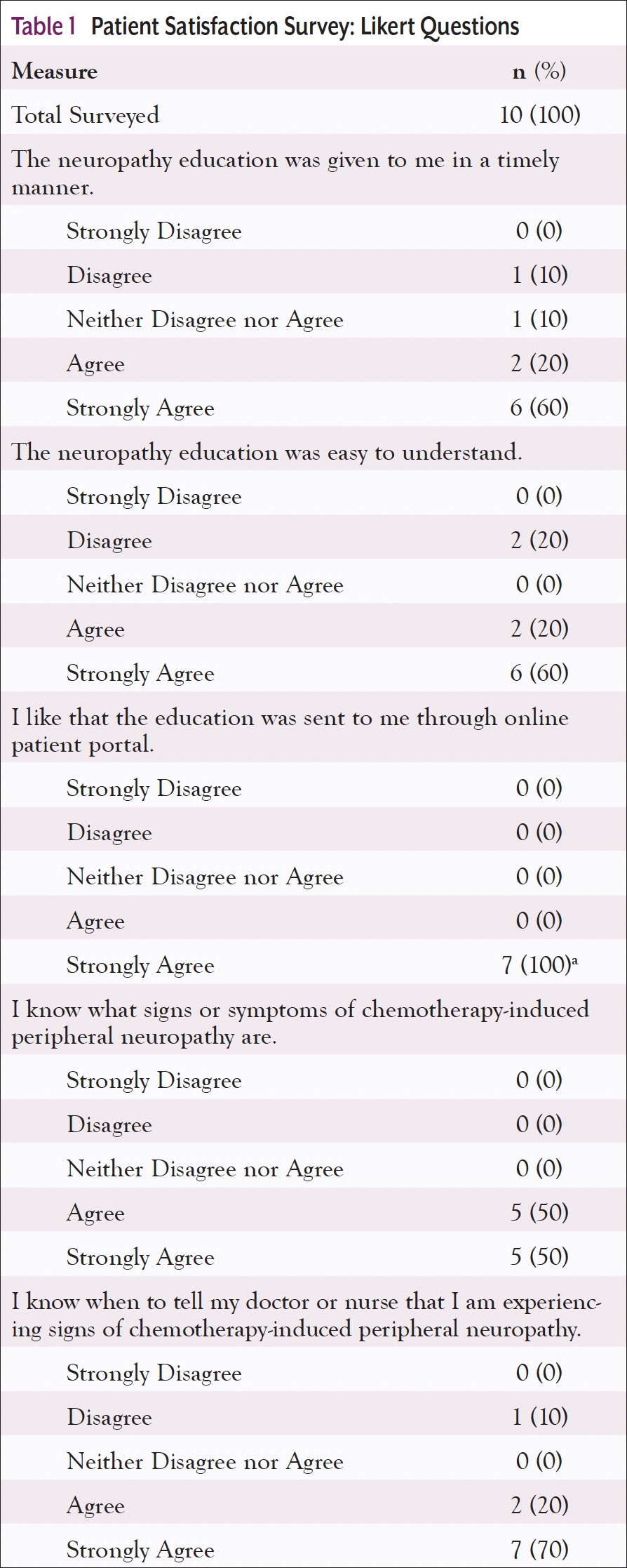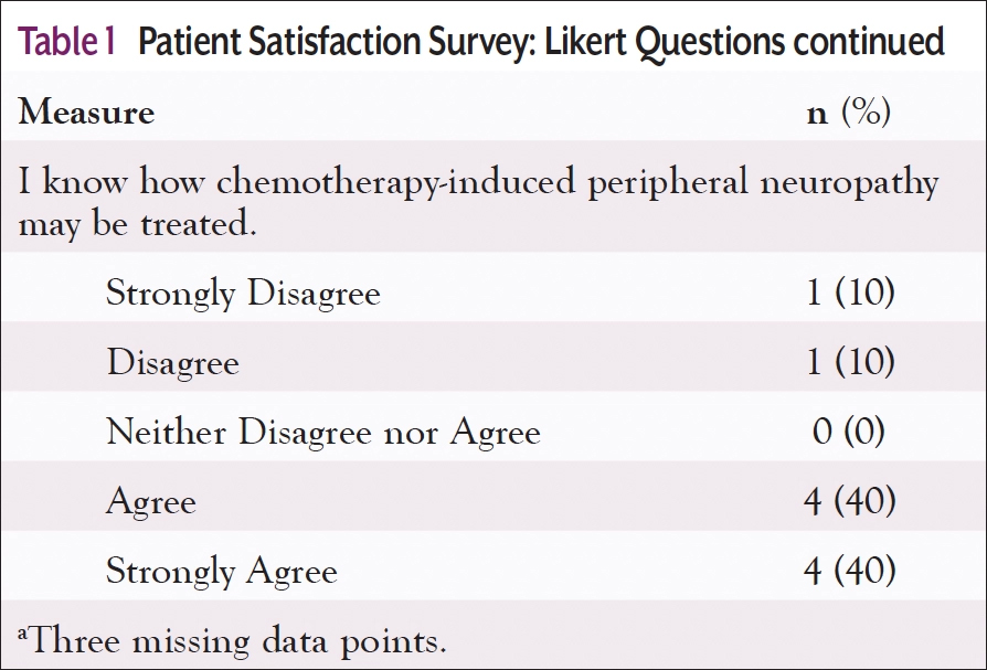 Results: Ten patients completed the satisfaction survey on CIPN education. Eight of 10 patients (80%) answered “Agree” or “Strongly agree” that the education was given in a timely manner. Eight of 10 patients (80%) answered that the education was easy to understand.