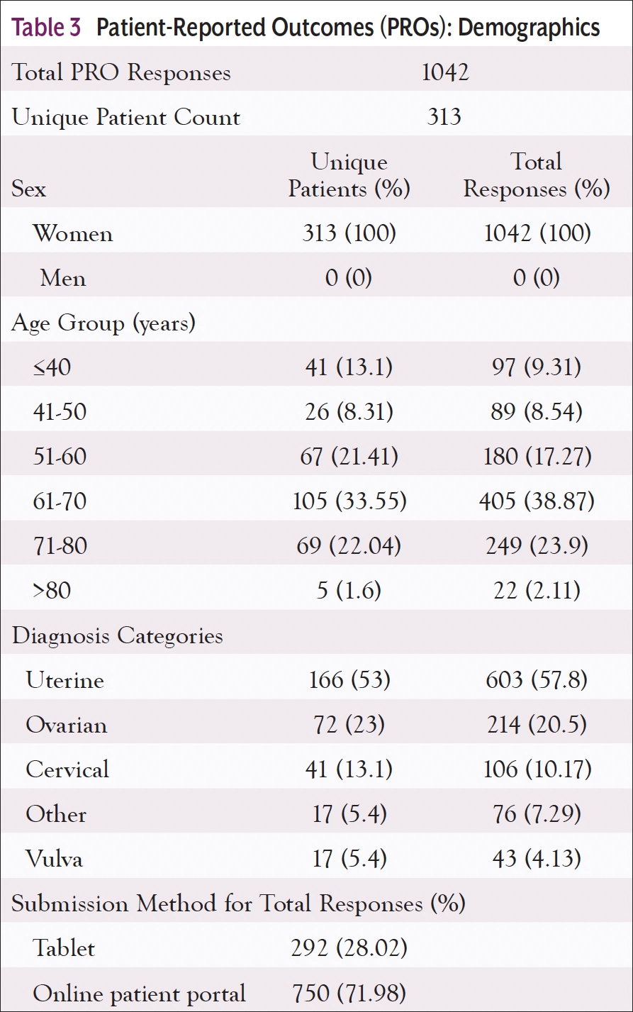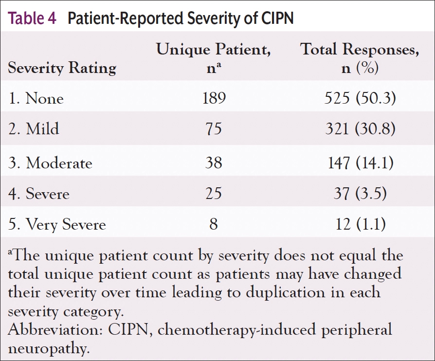To determine the incidence of CIPN in our gynecologic oncology population, we reviewed our patient-reported outcomes (PROs) data over 4 years (Table 3). Although more than half of the patients (189 of 313) reported no CIPN symptoms, 14.1% reported moderate symptoms, 3.5% reported severe symptoms, and 1.1% reported very severe symptoms (Table 4). The clinical team noted a lack of information for both providers and patients regarding CIPN in both the electronic health record and the existing patient education materials. Although the medical oncology providers reviewed the side effects of CIPN at the initial visit, patients were often overwhelmed with information. A plan was developed to have the nurse navigator contact new patients to reinforce and review the newly developed CIPN patient education after the first cycle of chemotherapy.