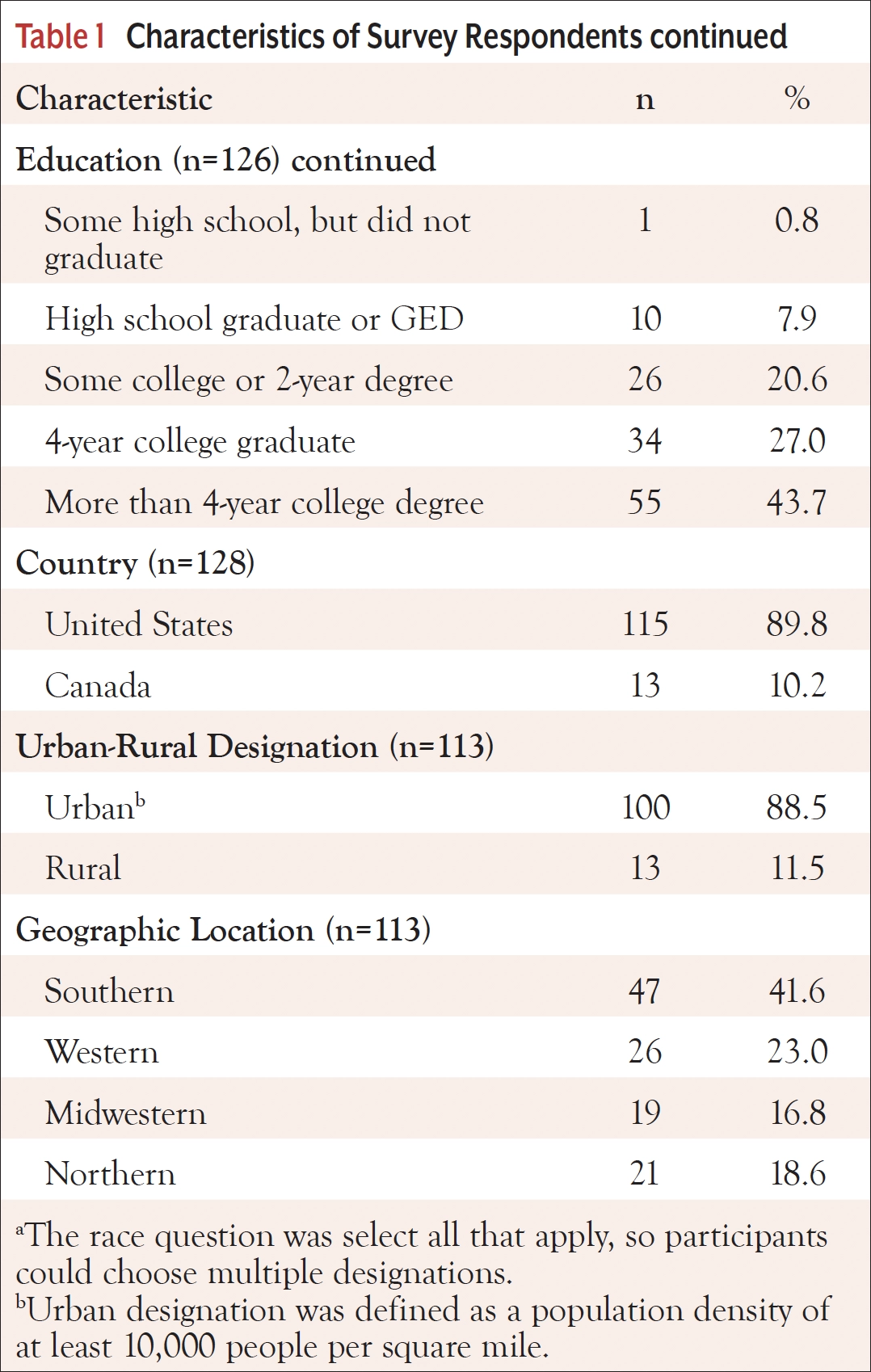 A total of 474 patients and caregivers were eligible for this study; 131 patients and caregivers completed the survey (28% response rate). Sixty-four percent (n=84) identified as a patient with blood cancer, and 36% (n=47) identified as a caregiver of someone diagnosed with blood cancer. Most respondents identified as female (52%, n=66), White (92%, n=114), and had at least a 4-year college degree (71%, n=89). Four percent identified as Hispanic or Latino (n=5). Forty-seven percent were 65 and older (n=60). Table 1 provides respondents’ demographic characteristics.