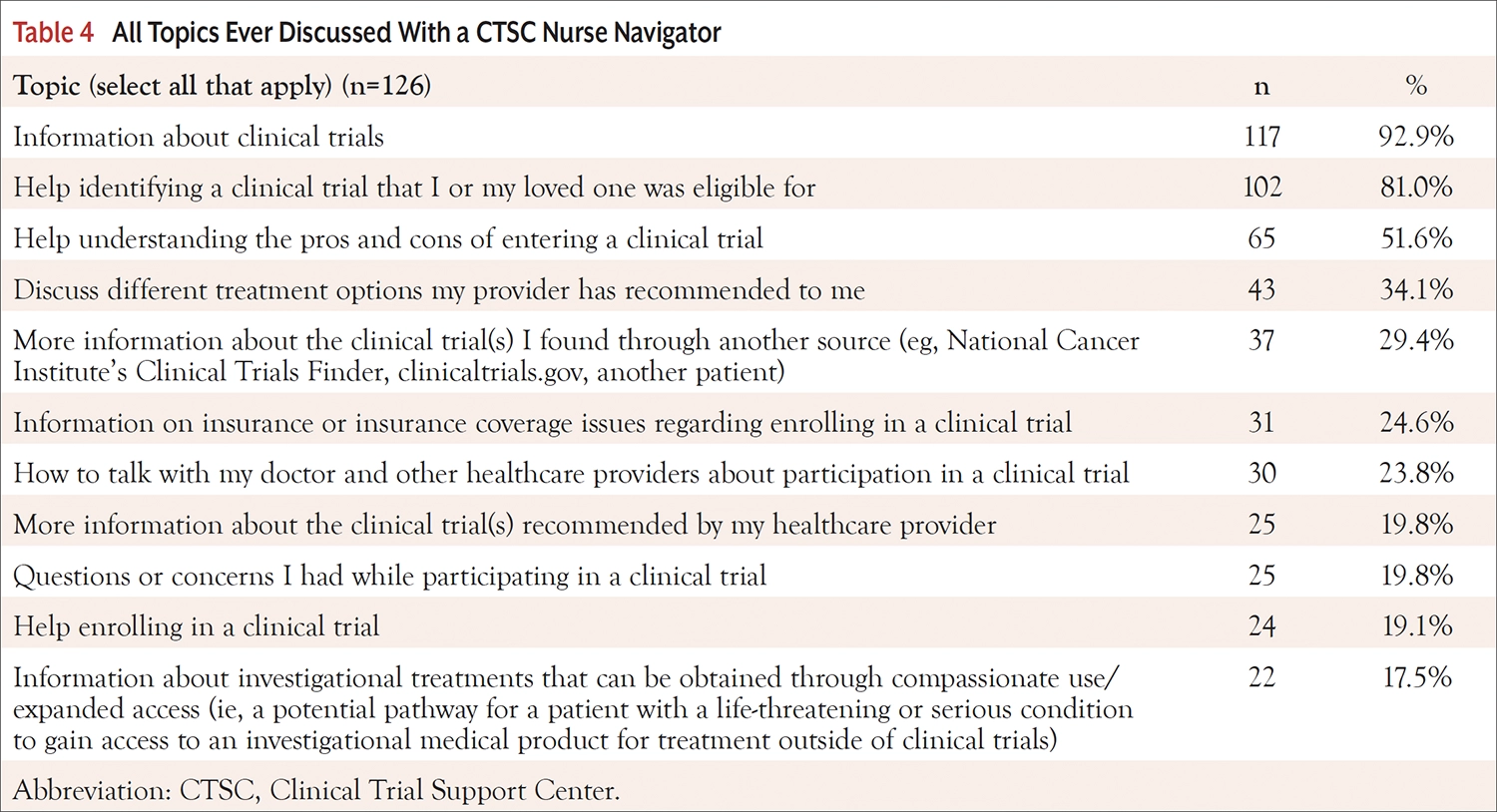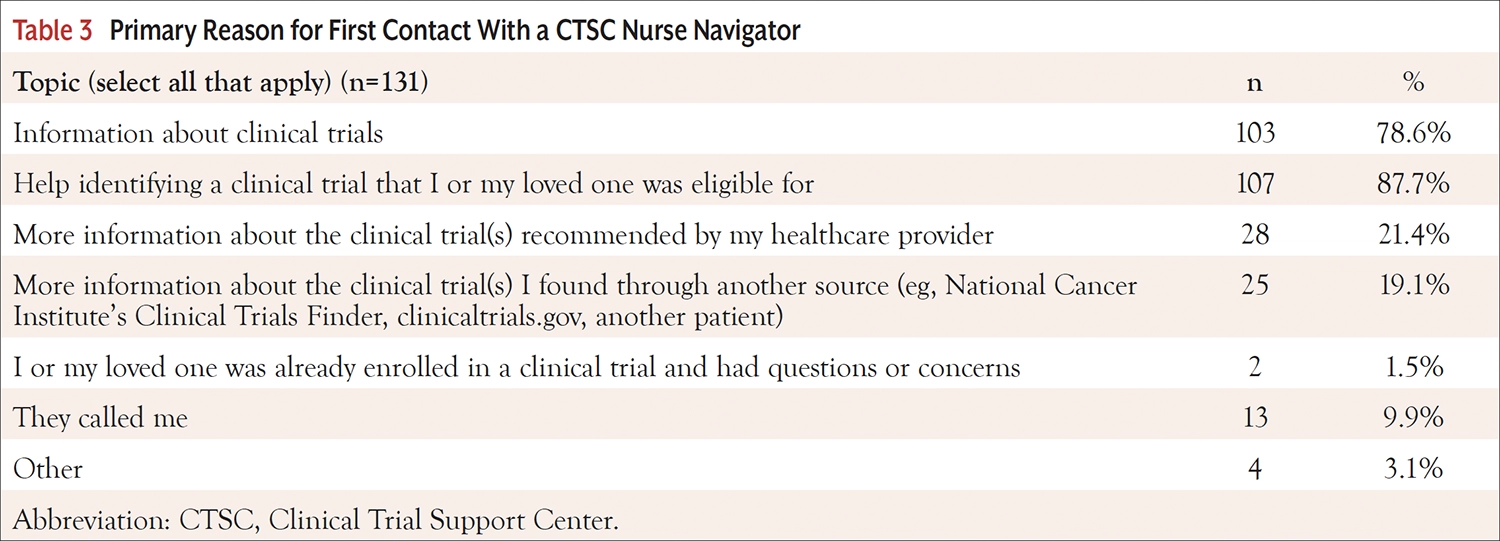 Results: Of 474 eligible patients/caregivers, 131 completed the survey (28% response rate). Most patients/caregivers reported contacting the CTSC to identify a trial they might be eligible for (81.7%), for general information about clinical trials (78.6%), about a trial recommended by a healthcare provider (21.4%), or one found through another source (19.1%). In addition to seeking help with identifying trials and learning about trials, patients/caregivers reported discussing with the nurse navigator insurance/coverage issues (25%) and how to talk with their healthcare provider about trial participation (24%). More than 93% of respondents reported that the nurse navigator gave them the information and support needed to make an informed decision about trial participation. After speaking to a nurse navigator, nearly 29.6% reported enrolling in a trial; the most common reasons for nonenrollment were that their doctor did not recommend it (33.7%), not eligible for any existing trial (30.3%), no trial available at a convenient location (24.7%), and chose a different type or plan of treatment than offered by trial(s) (23.6%). Interview respondents (n=10) described how the navigation enhanced their sense of control over the treatment decision-making process.