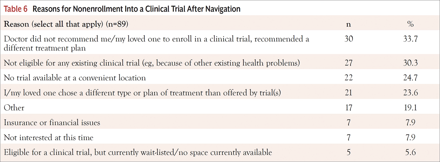 The most common reasons for nonenrollment were that the doctor did not recommend the patient to enroll in a clinical trial or recommended a different treatment plan (n=30, 33.7%), not eligible for any existing clinical trial (n=27, 30.3%), no trial available at a convenient location (n=22, 24.7%), and the patient/caregiver chose a different type or plan of treatment than offered by trial(s) (n=21, 23.6%). See Table 6 for the reasons for nonenrollment.