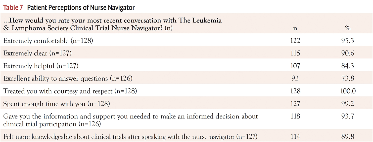Nurse navigators provided support equally across key demographic groups. Satisfaction did not vary significantly by age, gender, race, ethnicity, education, or whether the respondent lived in an urban or rural area. Similarly, no differences in satisfaction by clinical characteristics were reported, such as diagnosis or time since diagnosis. There were no significant differences in satisfaction with the service among those who did versus did not enroll in a clinical trial after speaking with a nurse navigator.