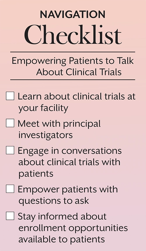Navigators should also aim to build relationships with the principal investigators (PIs) who lead these clinical studies. Open communication with PIs fosters collaboration and ensures that navigators are up-to-date on trial protocols and any changes to study parameters. This level of familiarity allows navigators to confidently engage with patients, providing accurate and relevant information that helps them engage in treatment conversations and make informed decisions about their care.