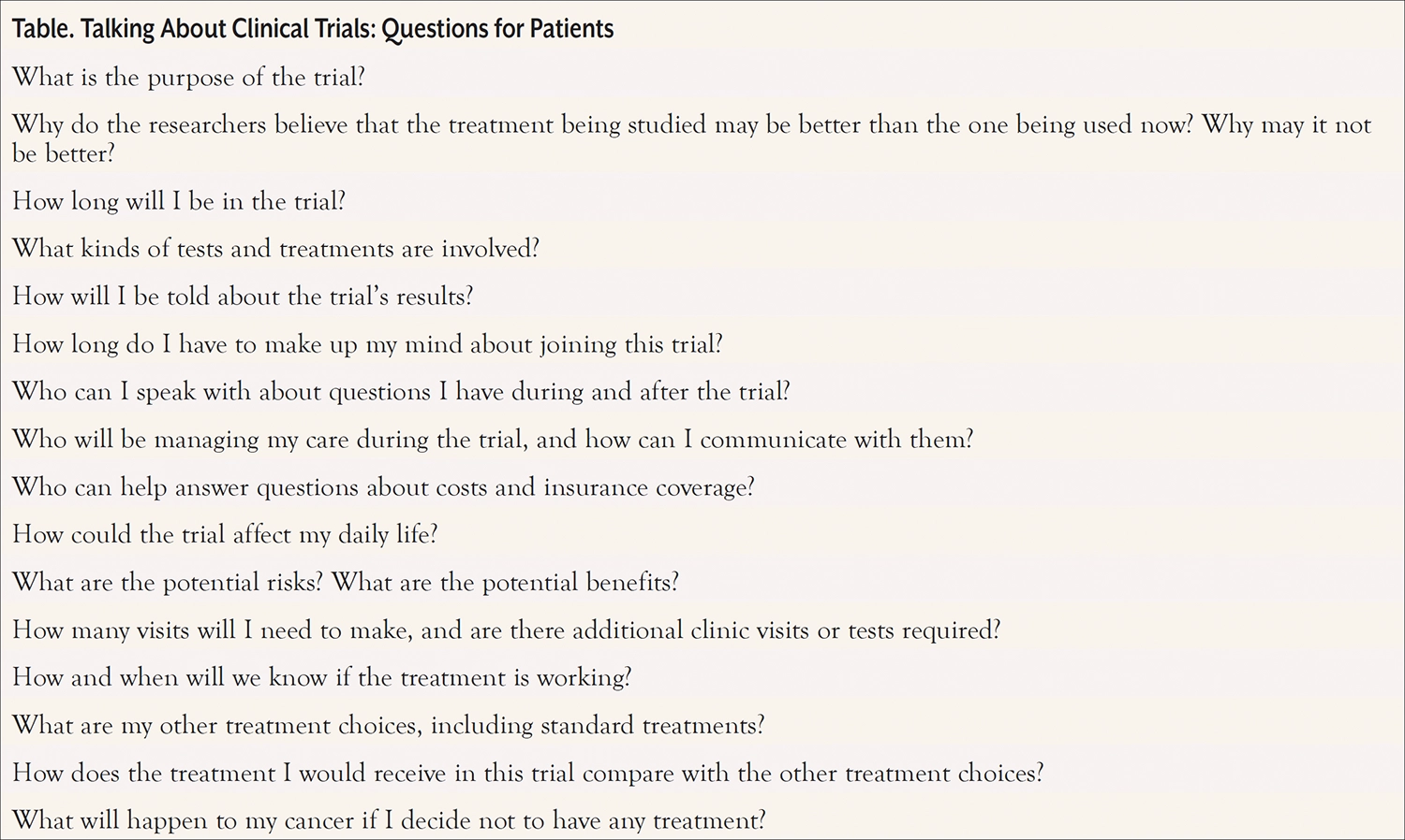 To empower patients to engage in meaningful conversations about clinical trials with their healthcare team, it’s crucial they know what questions to ask. The Table shows some essential questions patients can use to guide these discussions.