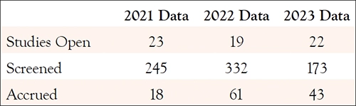 Over the 3-year study period, even though the number of open studies decreased slightly, patient accrual more than doubled. When comparing the data from 2021 to 2022, while the number of open studies decreased by 17%, the number of patients screened increased by 36% and enrollment increased by 239%. Comparing the data from 2022 to 2023 shows a 16% increase in open studies, a decrease in patients screened by 48%, and a decrease in total patient accruals of 30%. While these figures reflect decreases from 2022, they demonstrate a year-over-year improvement in the screened to accrual rate of 25%.