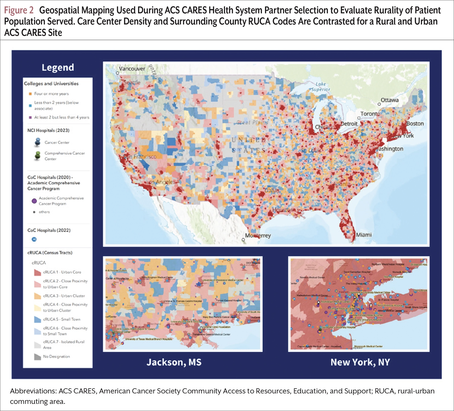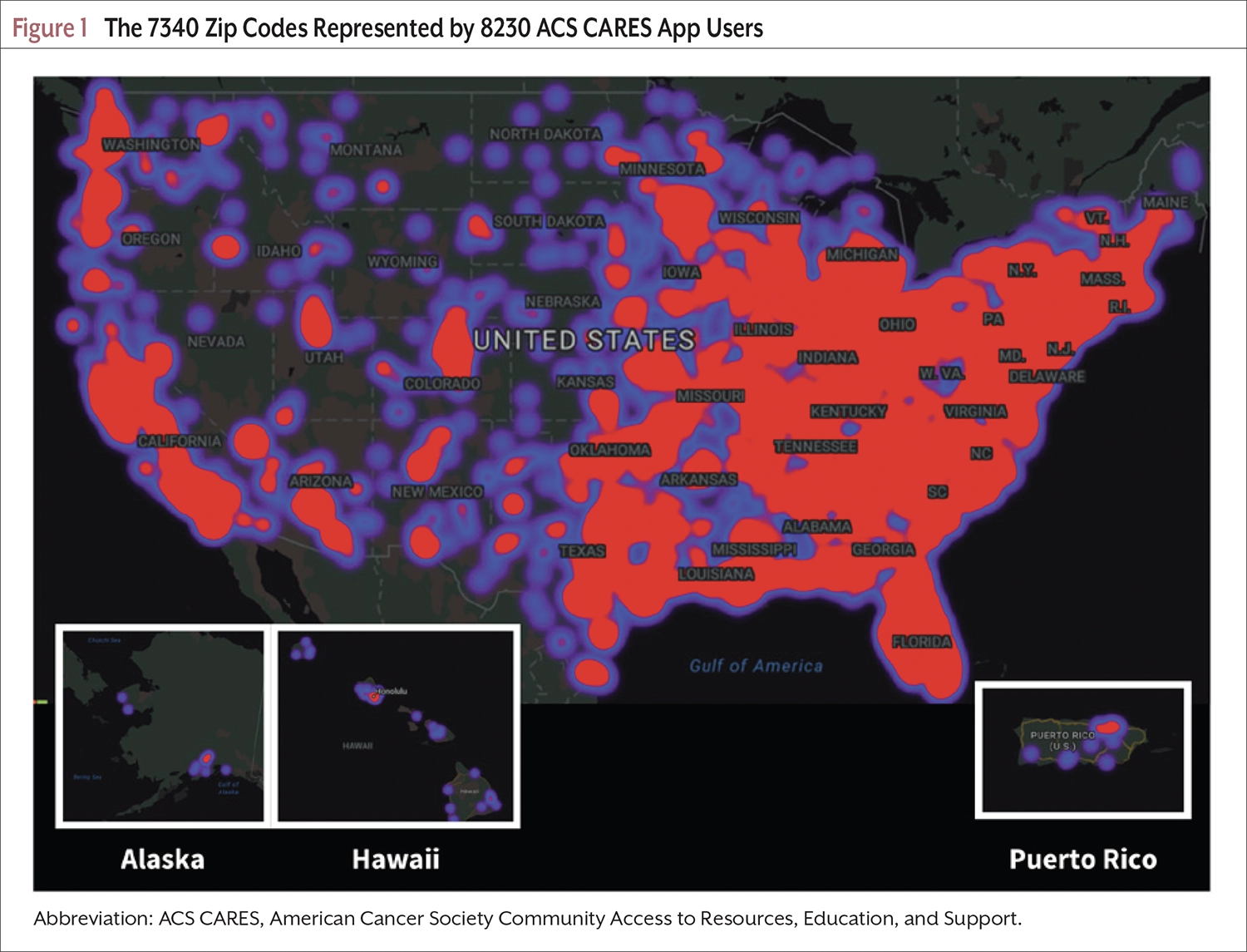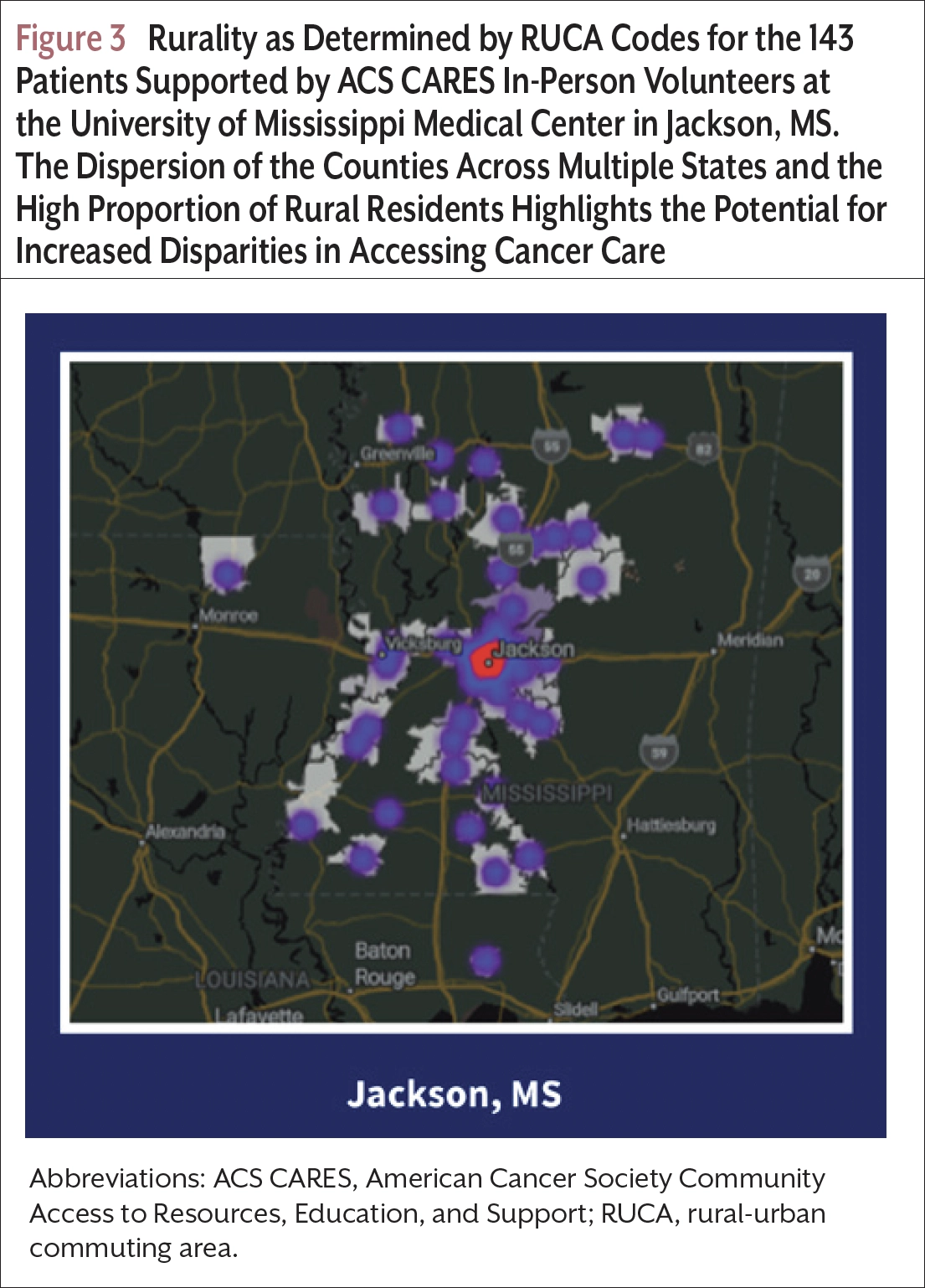 Launched on June 1, 2023, the ACS CARES program provides tailored information and resources accessible to patients via multiple modalities: a digital app, round-the-clock telephone assistance through the ACS National Cancer Information Center, virtual volunteer peer support, and in-person volunteer support at partner health systems. Using the NCCN Distress Thermometer and problem list, the ACS CARES program identifies patient or caregiver concerns and provides tailored information and support. The tiered program structure provides multiple access points for those with varying levels of digital or health literacy and to combat the widening digital divide noted among rural populations.8 Strategies for reducing geographic disparities include a targeted marketing campaign for app dissemination in rural communities, virtual volunteer peer support matching based on shared rural experience, and geographical information system (GIS) mapping using rural-urban commuting area (RUCA) codes during health system partner selection.