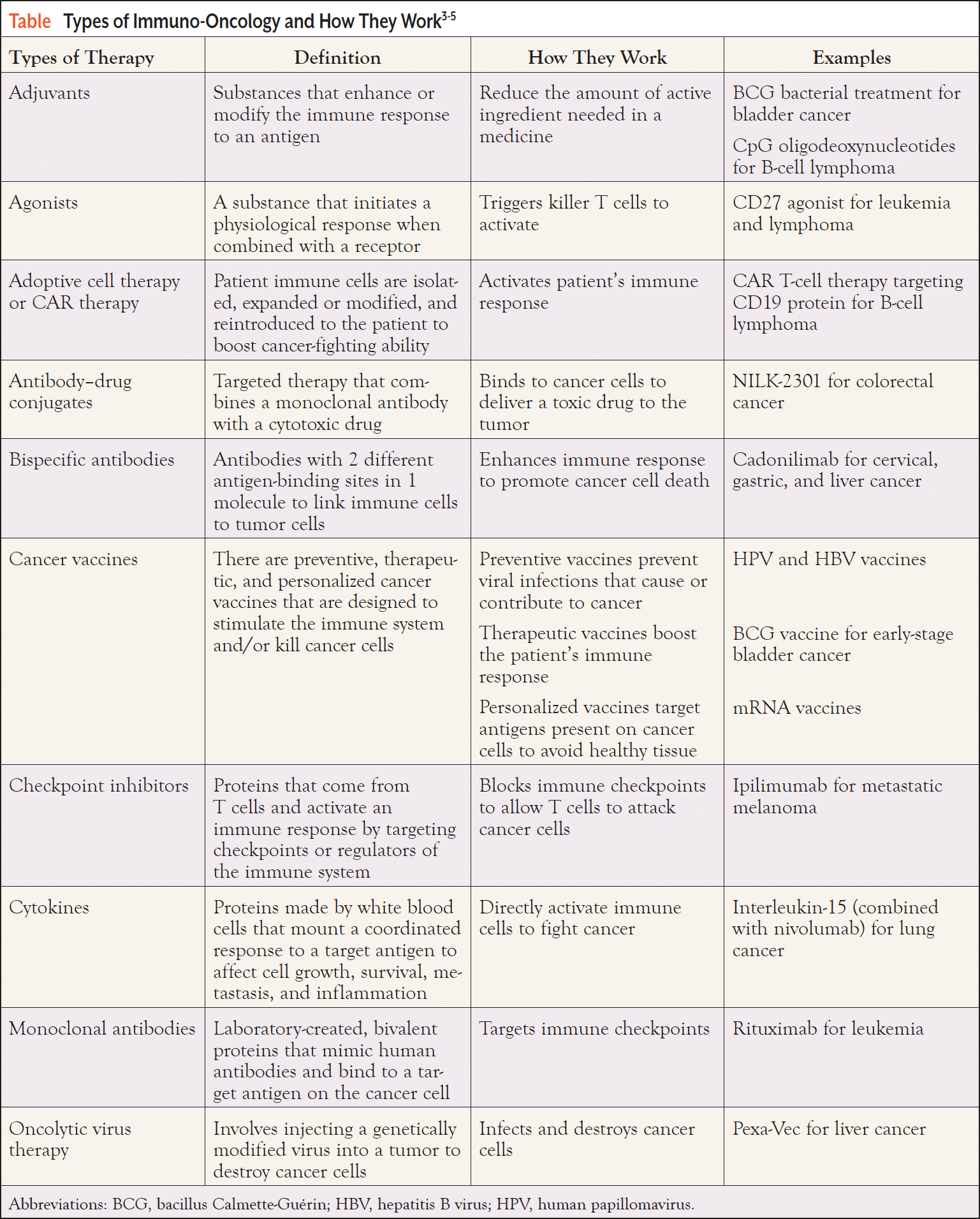 Immunotherapy is a newer kind of cancer treatment that helps a patient’s immune system fight cancer by stimulating the immune system to work harder and smarter to attack cancer cells.1,2 Immunotherapies for oncology include cancer vaccines, oncolytic virus therapy, checkpoint inhibitors, adoptive cell therapies, cytokines, monoclonal antibodies, bispecific antibodies, and antibody–drug conjugates (Table).3-5 Immunotherapy can be highly personalized, reducing side effects typical of chemotherapy and radiation therapy; however, immunotherapy comes with its own side effects (Box).6